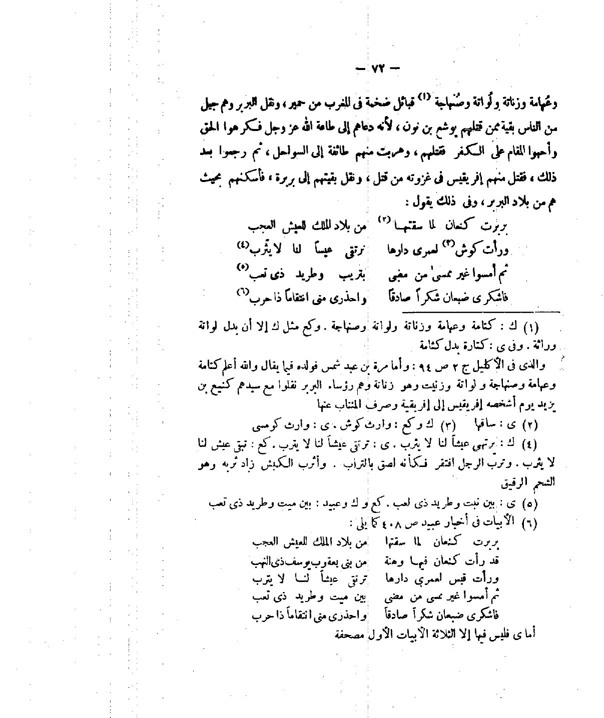 وعهامة وزنانة ولواتة وصنهاجة قبائل ضخمة في المغرب من حمير ونقل البربر وهم جيل من الناس بقية ممن قتلهم يوشع بن نوح، لأنه دعاهم إلى طاعة الله عز وجل فكرهوا الحق وأحبوا المقام على الكفر فقتلهم، وهربت منهم طائفة إلى السواحل ثم رجعوا بعد ذلك، فقتل منهم إفريقيس في غزوته من قتل، ونقل بقيتهم إلى بربرة، فأسكنهم بحيث هم من بلاد البربر، وفي ذلك يقول: