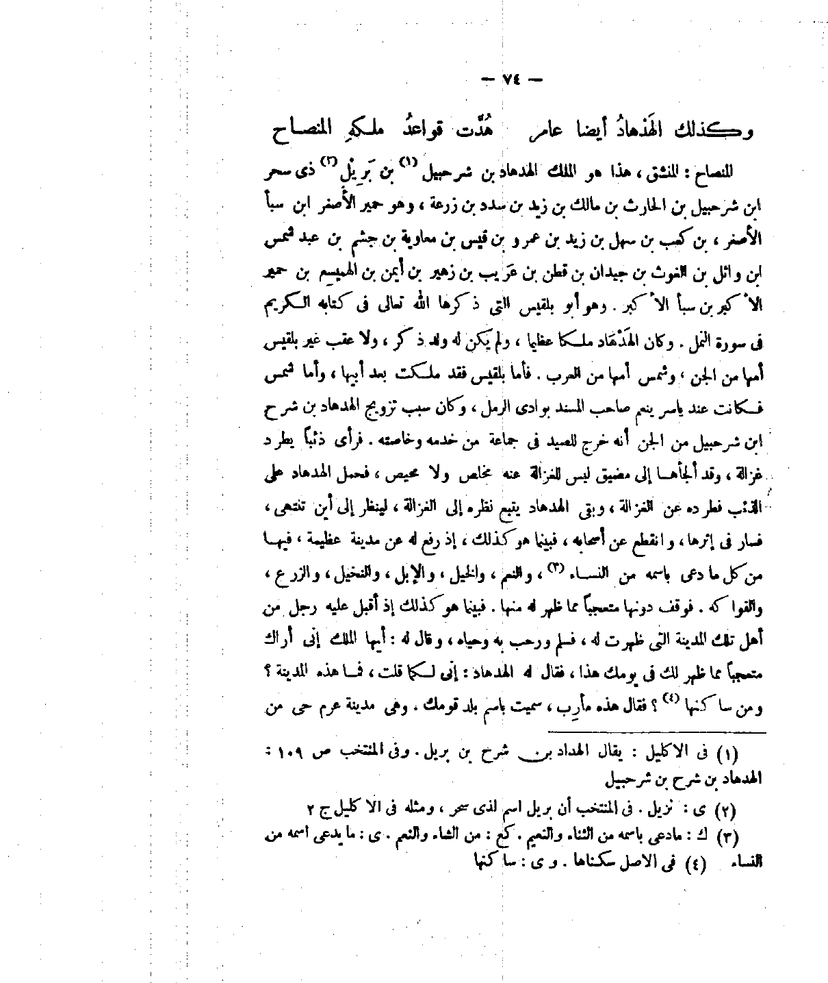 النصاح: المنشق، هذا هو الملك الهدهاد بن شرحبيل بن بريل ذي سحر أبن شرحبيل بن الحارث بن مالك بن زيد بن سدد بن زرعة، وهو حمير الأصغر أبن سبأ الأصغر بن كعب بن سهل بن زيد بن عمرو بن قيس بن معاوية بن جشم بن عبد شمس أبن وائل بن الغوث بن جيدان بن قطن بن عريب بن زهير بن أيمن بن الهميسع بن حمير الأكبر بن سبأ الأكبر. وهو أبو بلقيس التي ذكرها الله تعالى في كتابه العظيم في سورة النمل. وكان الهدهاد ملكا عظيما، ولم يكن له ولد ذكر، ولا عقب غير بلقيس أمها من الجن، وشمس أمها من العرب. فأما بلقيس فقد ملكت بعد أبيها وأما شمس فكانت عند ياسر ينعم صاحب امسند بوادي الرمل، وكان يبب تزويج الهدهاد بن شرح أبن شرحبيل من الجن أنه خرج للصيد في جماعة من خدمه وخاصته. فرأى ذئبا يطرد غزالة، وقد ألجأها إلى مضيق ليس للغزالة مخلص عنه ولا محيص، فحمل الهدهاد على الذئب فرده عن الغزالة، وبقي الهدهاد يتع نظره إلى الغزالة، لينظر إلى أين تنتهي، فسار في إثرها، وانقطع عن أصحابه، فبينما هو كذلك، إذ رفع له عن مدينة عظيمة، فيها من ما دعى باسمه من النساء، والنعم، والخيل، والإبل، والنخيل، والزرع، والفواكه،. فوقف دونها متعجبا مما ظهر له منها. فبينما هو كذلك إذا أقبل عليه رجل من