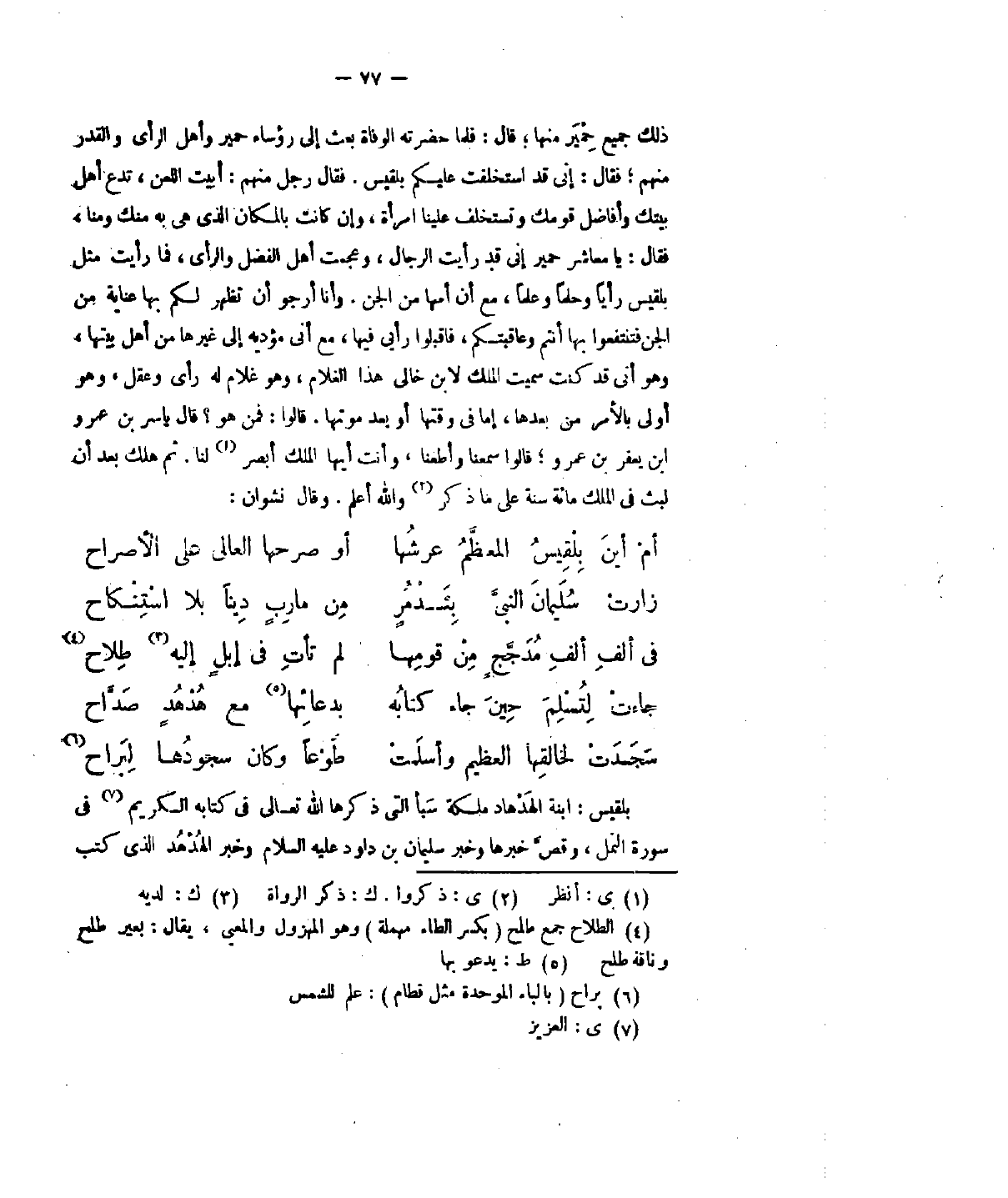 ذلك جميع حمير منها، وقال: فلما حضرته الوفاة بعث رؤساء حمير وأهل الرأي والقدر منهم، فقال: إني استخلفت عليكم بلقيس. و. . . . . . رجل منهم: أبيت اللعن، تدع أهل بيتك وأفاضل قومك وتستخلف علينا امرأة، وإنْ كانت بالمكان الذي هي به منك ومنا، فقال: يا معاشر حمير إني قد رأيت الرجا وعجمت أهل الفضل والرأي، فلما رأيت مثل بلقيس رأيا وحلما وعلما، مع أنْ أمها من الجن. وأنا أرجو أنْ