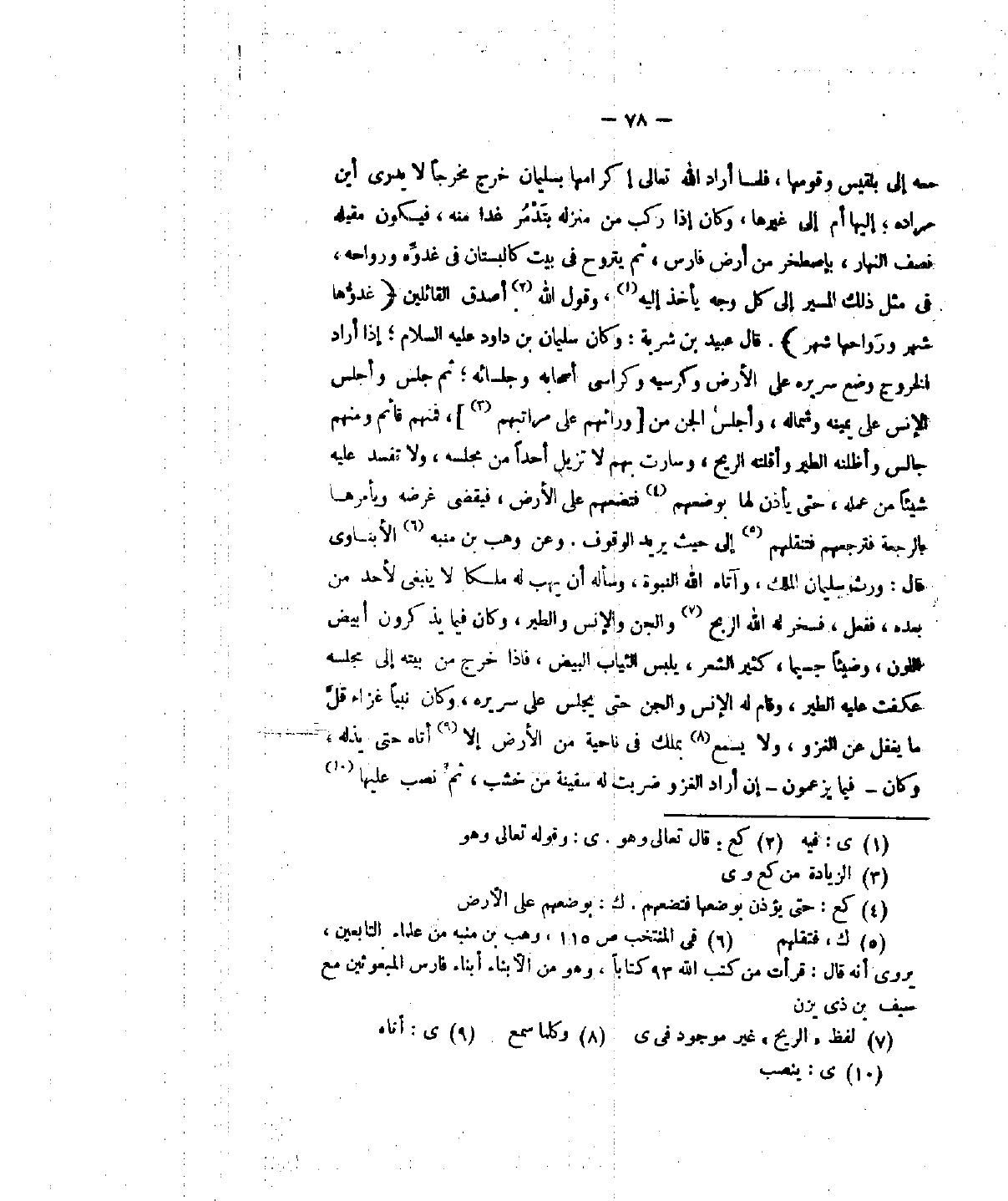 بوضعها فتضعها على الأرض، فيقضي غرضه ويأمرها بالرجعة فترجعهم فتنقلهم إلى حيث يريد الوقوف. وعن وهب بن منبة الأبناوي قال: ورث سليمان الملك، وآتاه الله النبوة، وسأله أنْ يهب له ملكا لا ينبغي لأحد من بعده، ففعل، فسخر الله له الريح والجن والإنس والطير، وكان فيما يذكرون أبيض اللون، وضيئا جسيما، وكثير الشعر، يلبس الثياب البيض، فإذا خرج من بيته إلى مجلسه عكفت عليه الطير، وقام له الإنس والجن حتى يجلس على سريره، وكان نبيا غزاء قل ما يغفل عن الغزو، ولا يسمع بملك في ناحية من الأرض إلاّ أتاه حتى يذله، وكان - فما يزعمون - إنْ أراد الغزو ضربت له سفينة من خشب، ثم نصب عليها