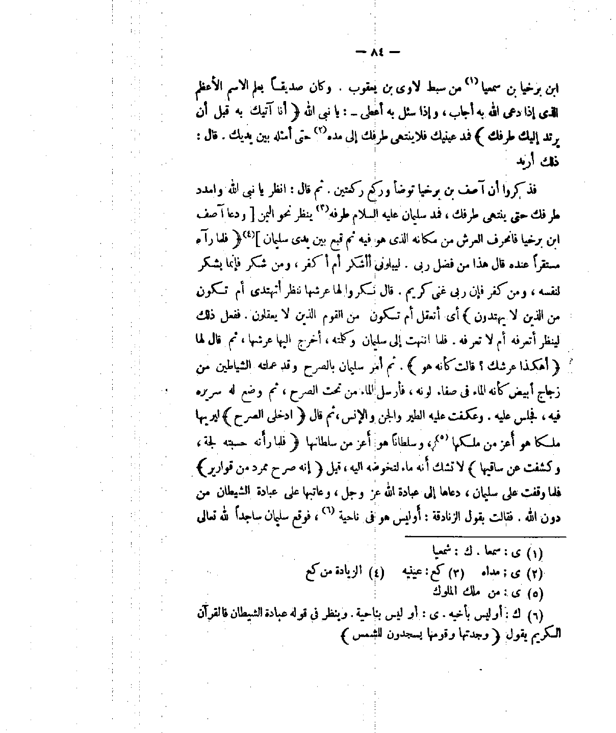 فذكروا أنَّ آصف بن برخيا توضأ وركع ركعتين وقال: انظر يا نبي الله وامدد طرفك حتى ينتهي طرفك، فمد سليمان عليه السلام طرفه ينظر نحو اليمن ودعا آصف أبن برخيا فانحرف العرش من مكانه الذي هو فيه ثم قبع بين يدي سليمان (فلما رآه مستقراً عنده قال هذا من فضل ربي. ليبوني أأشكر أم أكفر، ومن شكر فإنما يشكر لنفسه، ومن كفر فإنَّ ربي غني كريم. قال نكروا لها عرشها ننظر أتهتدي أم تكون من الذين لا يهتدون) أي أتعقل أم يكون من القوم الذين لا يعقلون. ففعل ذلك لينظر أتعرفه أم لا تعرفه. فلما انتهت إلى سليمان وكلمته، أخرج إليها عرشها، ثم قال لها (أهكذا عرشك؟ قالت كأنه هو). ثم أمر سليمان بالصرح وقد عملته الشياطين من زجاج أبيض كأنه الماء في صفاء لونه، فأرسل الماء من تحت الصرح، ثم وضع له سريره فيه، فجلس عليه. وعكفت عليه الطير والجن والإنس، ثم قال (ادخلي الصرح) ليريها ملكا هو أعز من ملكهاو سلطانا أعز من