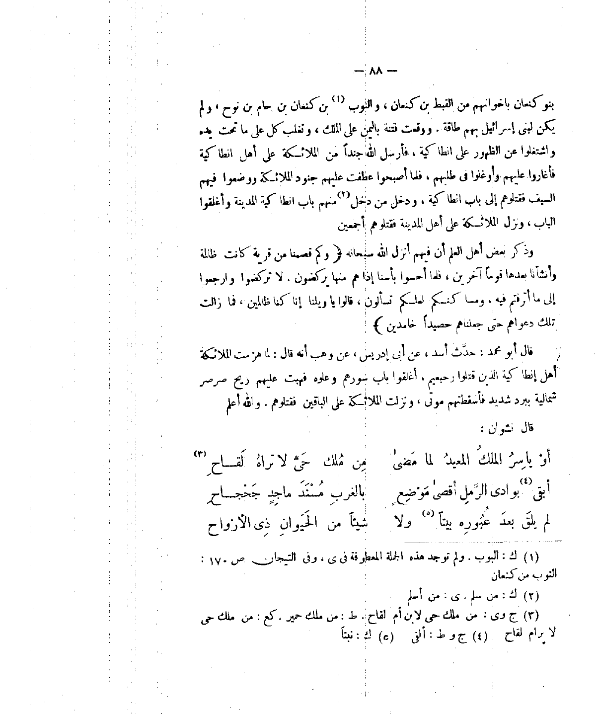 بنو كنعان باخوانهم من القبط من كنعان، والنواب بن كنعان بن حام بن نوح، ولم يكن لبني إسرائل بهم طاقة. ووقعت فتنة باليمن على الملك، وتغلب كل على ما تحت يده وانشغلوا عن الظهور على أنطاكية، فأرسل الله جناً من الملائكة على أهل انطاكية فأغاروا عليهم وأوغلوا في طلبهم، فلما أصبحوا عطفت عليهم جنود الملائكة ووضعوا فيهم السيف فقتلوهم إلى باب انطاكية، ودخل منهم انطاكية المدينة وأغلقوا الباب، ونزل الملائكة على أهل المدينة فقتلوهم أجمعين