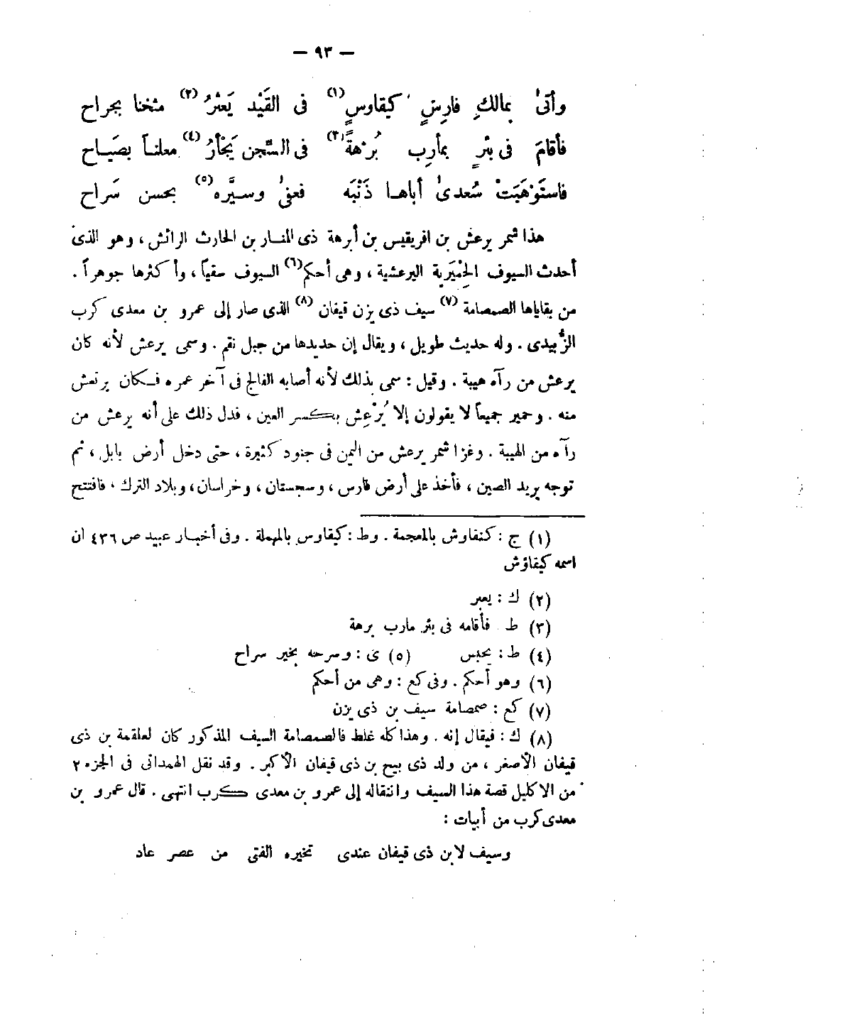 هذا شمر يرعش بن افريقيس بن أبرهة ذي المنار بن الحارث الرائش، وهو الذي أحدث السيوف الحميرية اليعرشية، وهي أحكم السيوف سقياً، وأكثرها جوهراً. من بقاياها الصمصامة سيف ذي يزن قيفان الذي صار إلى عمرو بن معدي كرب الزبيدي. وله حديث طويل، ويقال إنَّ حديدها من جبل نقم. وسمي يعرش لأنه كان يرعش من رآه هيبة. وقيل: سمى بذلك لأنه أصابه الفالج في آخر عمره فكان يرتعش منه. وحمير جميعاً لا يقولون إلاّ يرعش بكسر العين، فدل ذلك على أنَّه يرعش من رآه من الهيبة. وغزا شمر يرعش من اليمن في جنود كثيرة، حتى دخل أرض بابل، ثم توجه يريد الصين، فأخذ على أرض فارس، وسجستان، وخراسان، وبلاد الترك، فافتتح