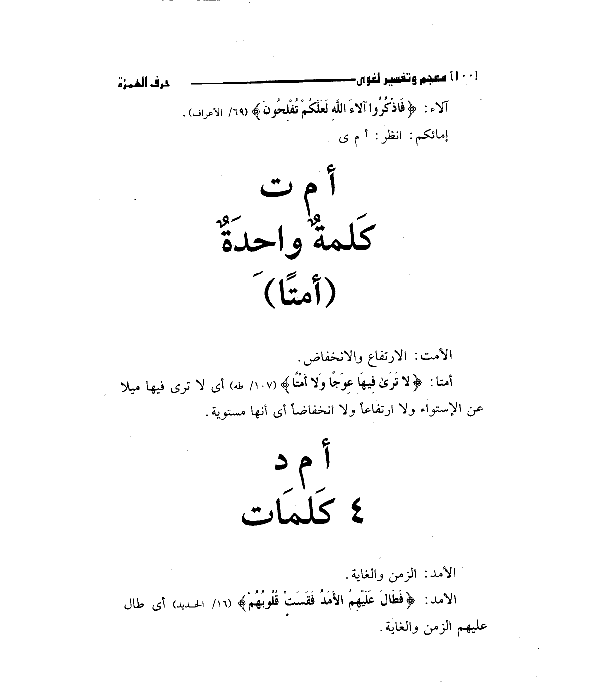 أمتا: (لا تَرَى فِيهَا عِوَجاً وَلا أَمْتاً) "107/ طه " أي لا تري فيها ميلا عن الاستواء ولا ارتفاعا ولا انخفاضا أي أنها مستوية.