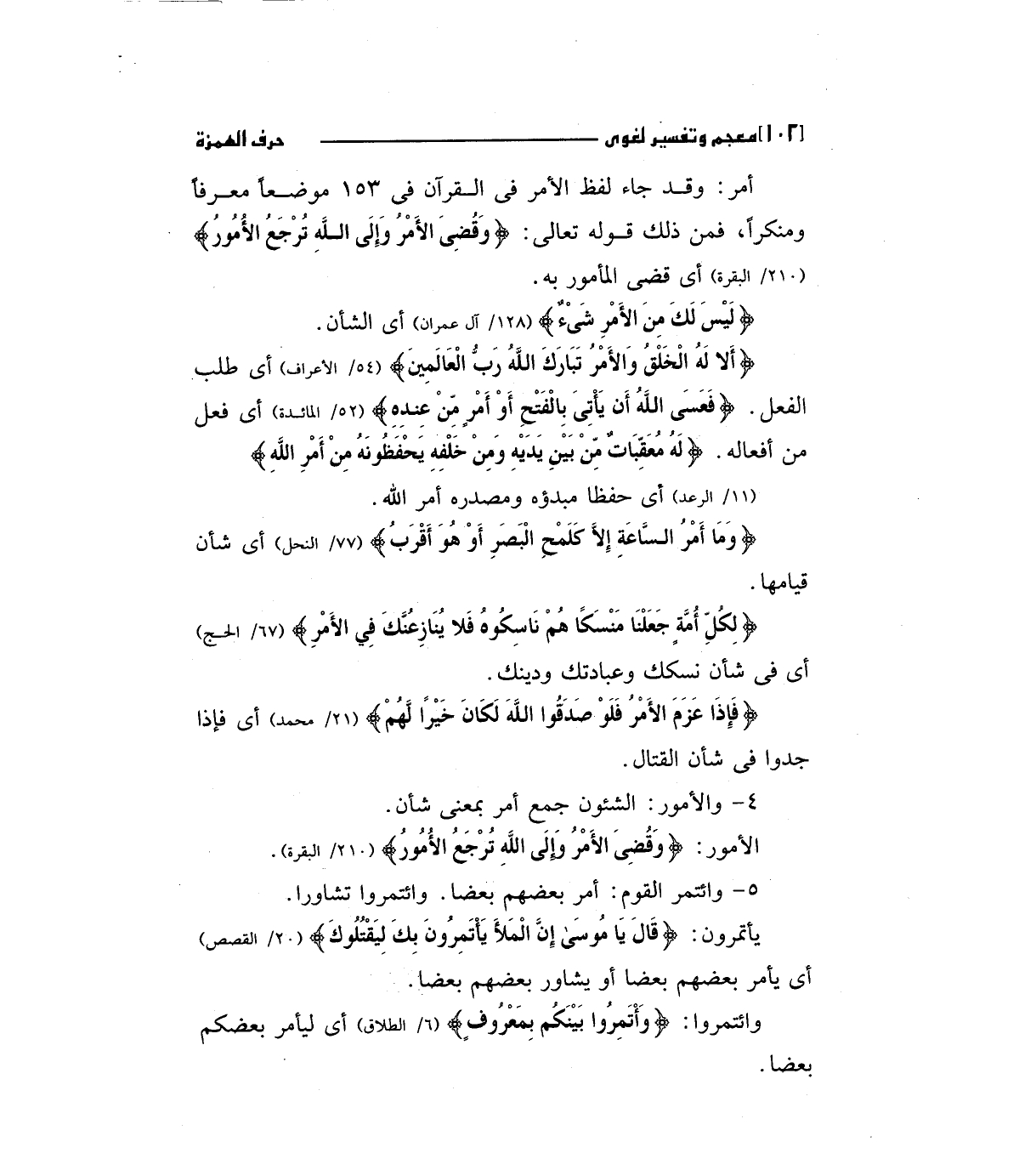 أمر: وقد جاء لفظ الأمر فى القرآن فى 153 موضعا معرفا ومنكرا، فمن ذلك قوله تعالى: " وَقُضِيَ الأَمْرُ وَإِلَى اللَّهِ تُرْجَعُ الأُمُورُ" (210 / البقرة) أى قضى المأمور به.