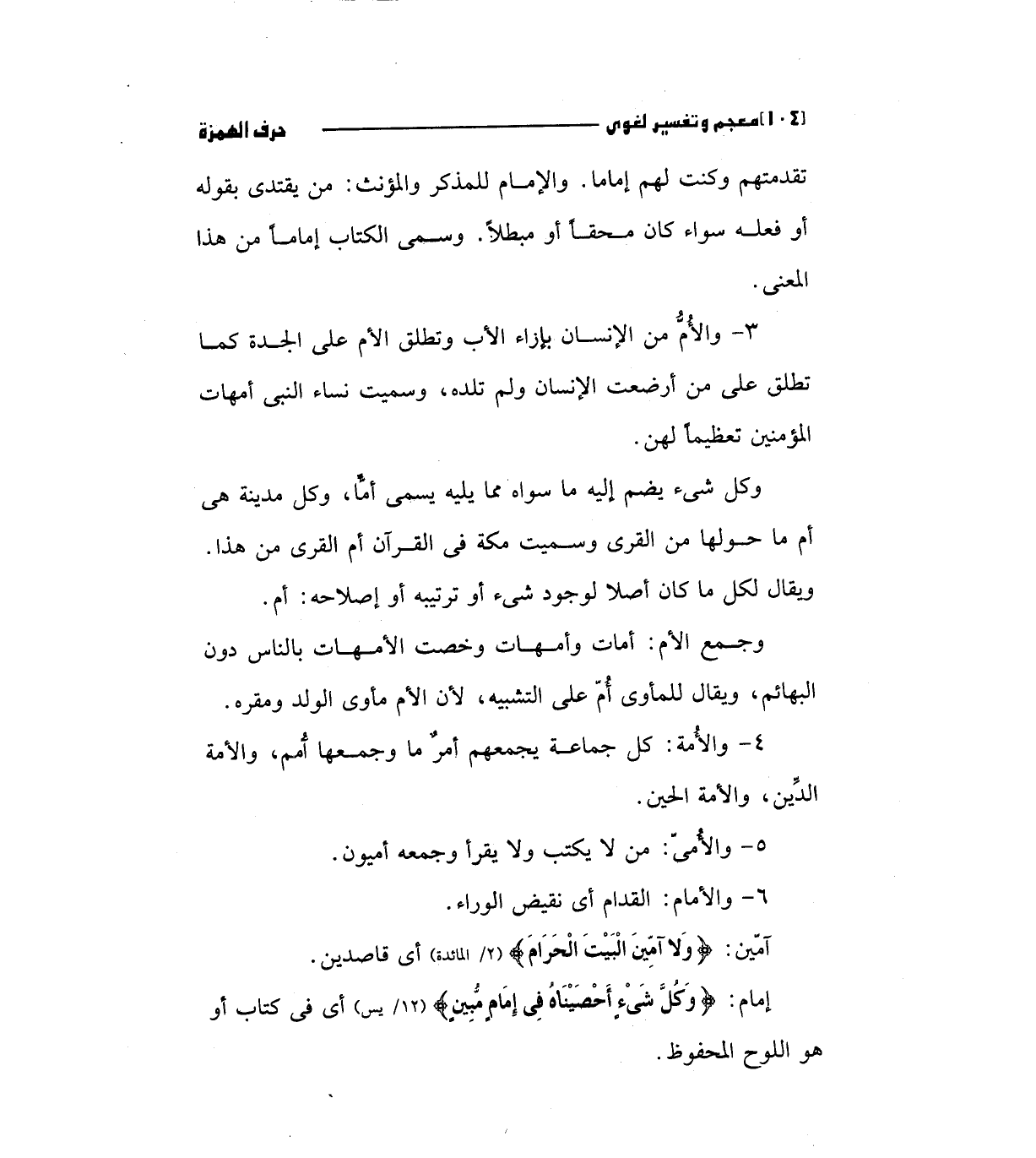 وكل شئ يضم إليه ما سواه مما يليه يسمي أما، وكل مدينة هي أم ما حولها من القري وسميت مكة في القرآن أم القري من هذا ويقال لكل ما كان أصلا لوجود شئ أو ترتيبه أو إصلاحه: أم وجمع الأم: أمات وأمهات وخصت الأمهات بالناس دون البهائم ويقال للمأوي أم علي التشبيه، لأن الأم مأوي الولد ومقره.