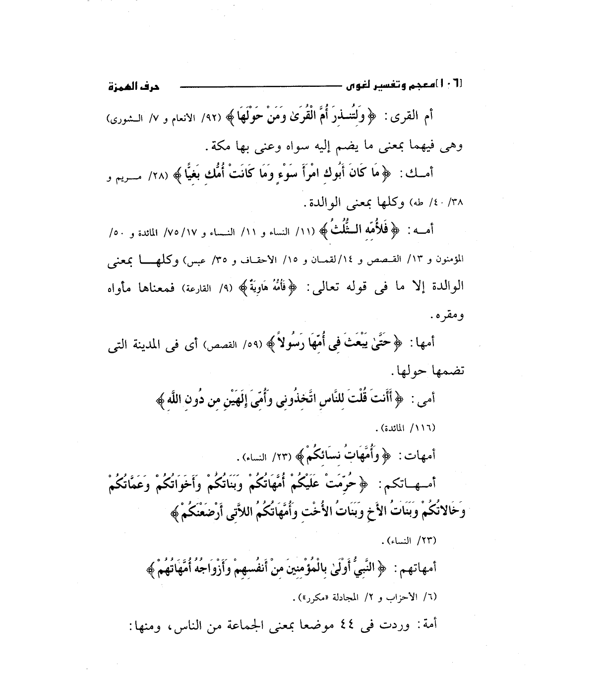 أمة: (فَلأُمِّهِ الثُّلُثُ) "11/ النساء و11/ النساء و17/ 75/المائدة و50/ المؤمنون و 13/ القصص و 14/ لقمان و 15/ الأحقاف و 35/ عبس) وكلها بمعني الوالدة إلا ما في قوله تعالي: (فَأُمٌهً هَاوبَهٌ) (9/ القارعة) فمعناها مأواه ومقره.