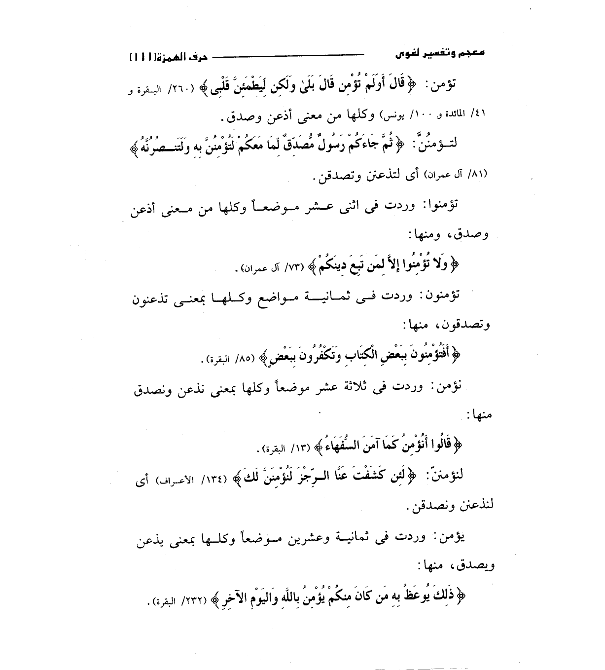 تؤمنوا: وردت في اثني عشر موضعا وكلها من معني أذعن وصدق، ومنها: