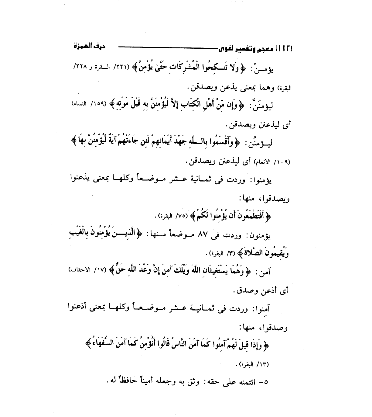 يؤمنوا: وردت في ثمانية عشر موضعا وكلها بمعني يذعنوا ويصدقوا، منها: