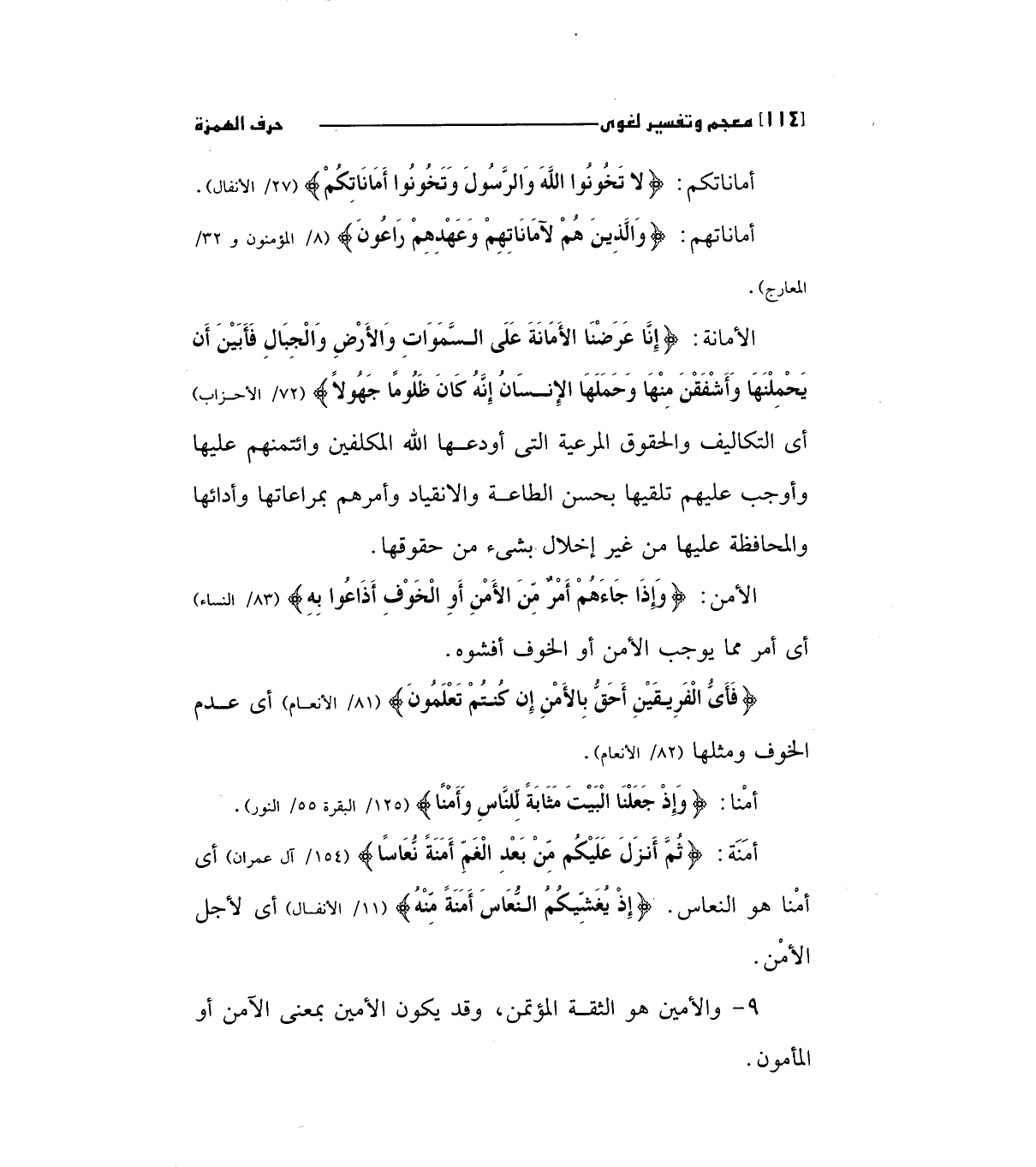 الأمانة: (إِنَّا عَرَضْنَا الأَمَانَةَ عَلَى السَّمَوَاتِ وَالأَرْضِ وَالْجِبَالِ فَأَبَيْنَ أَنْ يَحْمِلْنَهَا وَأَشْفَقْنَ مِنْهَا وَحَمَلَهَا الإِنْسَانُ إِنَّهُ كَانَ ظَلُوماً جَهُولاً (72)) "72/ الأحزاب "أي التكاليف والحقوق المرعية التي أودعها الله المكلفين وائتمنهم عليها وأوجب عليهم تلقيها بحسن الطاعة والانقياد وأمرهم بمراعاتها وأدائها والمحافظة عليها من غير إخلال بشئ من حقوقها.