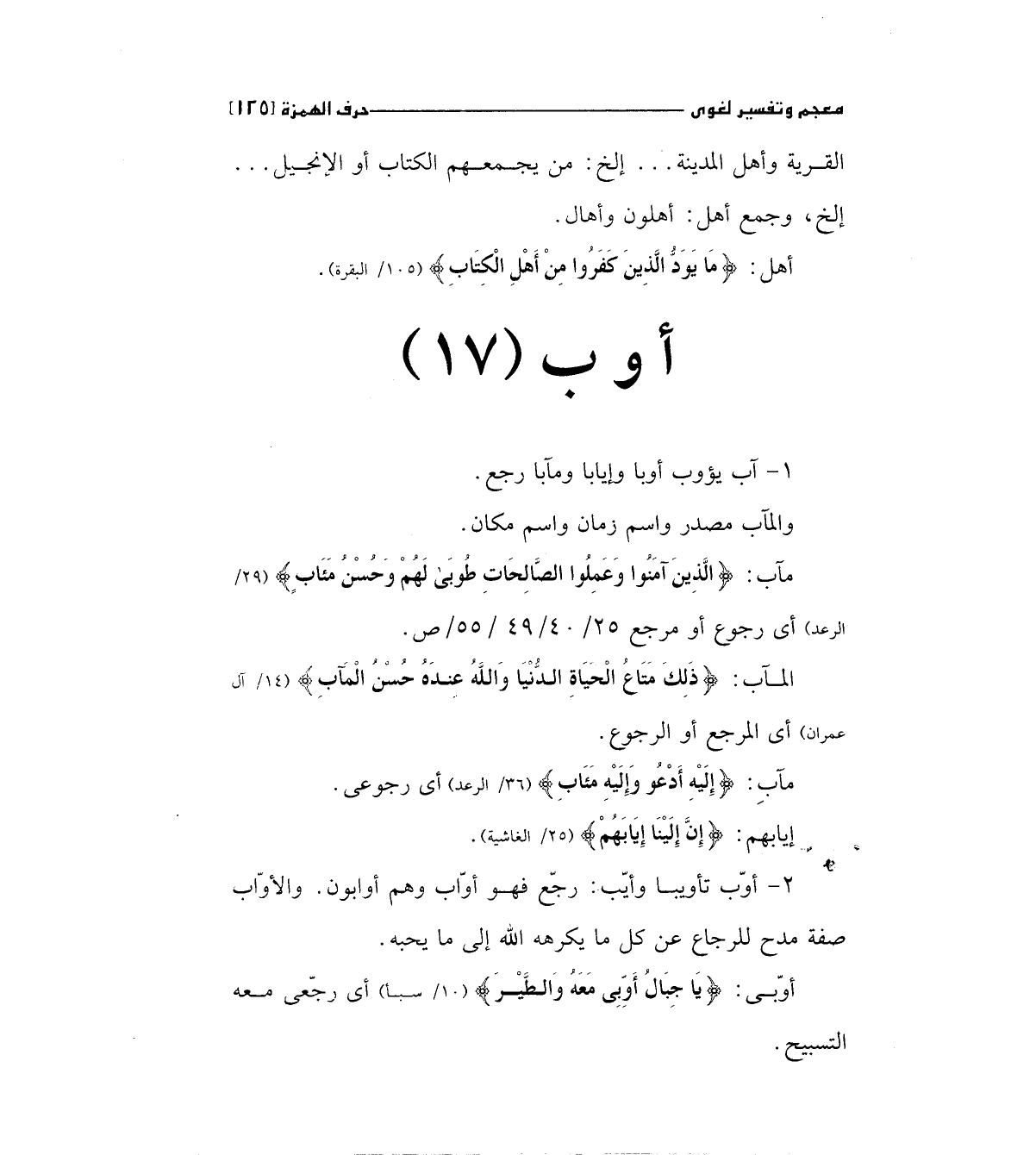 مآب: (الَّذِينَ آمَنُوا وَعَمِلُوا الصَّالِحَاتِ طُوبَى لَهُمْ وَحُسْنُ مَآبٍ (29)) "29/ الرعد " أي رجوع أو مرجع 25/ 40/49/ 55/ص.