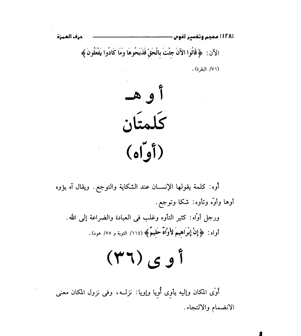 ورجل أواه: كثير التأوه وغلب في العبادة والضراعة إلي الله أواه: (إِنَّ إِبْرَاهِيمَ لأَوَّاهٌ حَلِيمٌ) "114/التوبة و75/هود ".