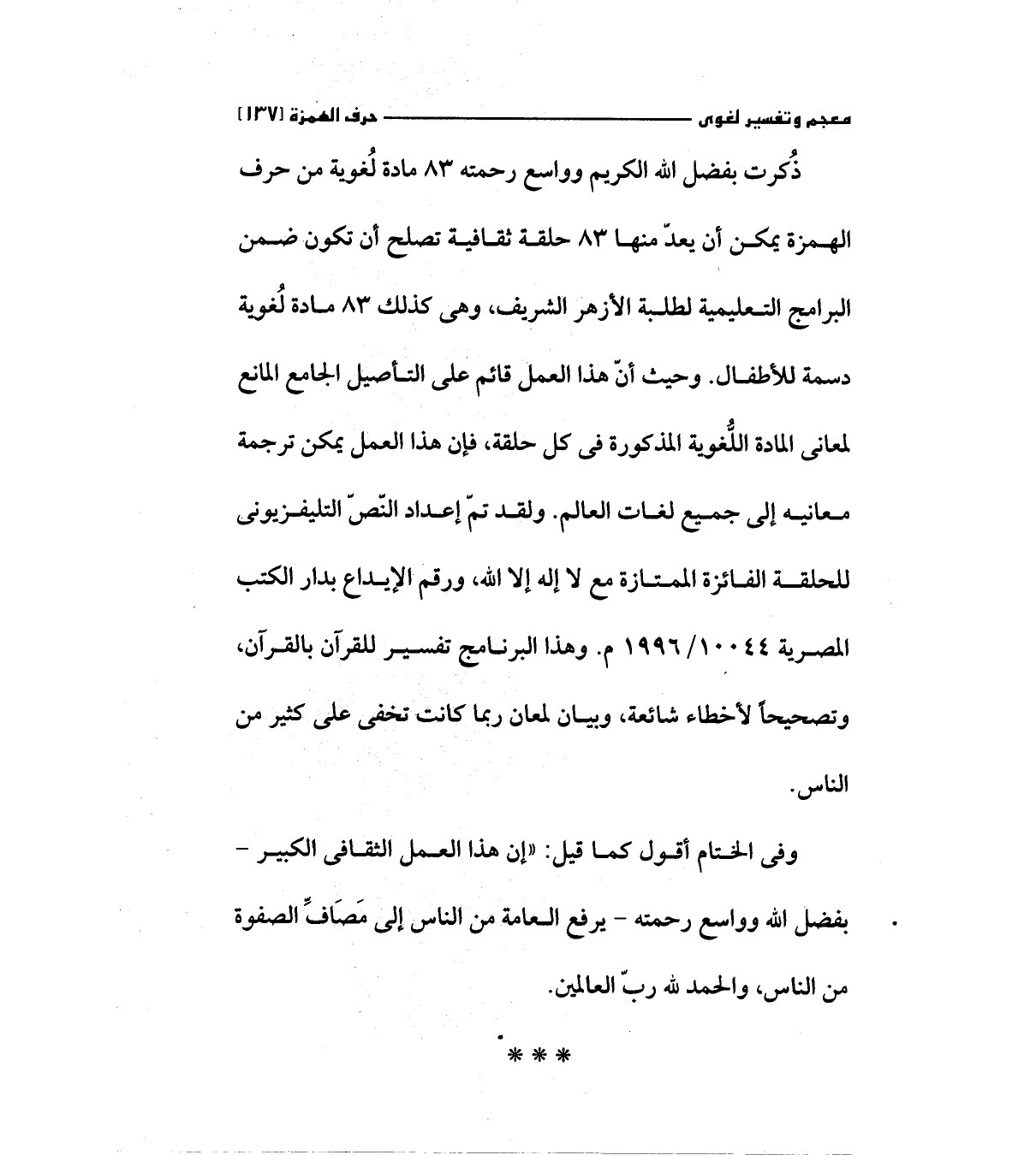 وفى الختام أقول كما قيل: " إن هذا العمل الثقافي الكبير - بفضل الله وواسع رحمته - يرفع العامة من الناس إلى مصاف الصفوة من الناس والحمد لله ري العالمين.
