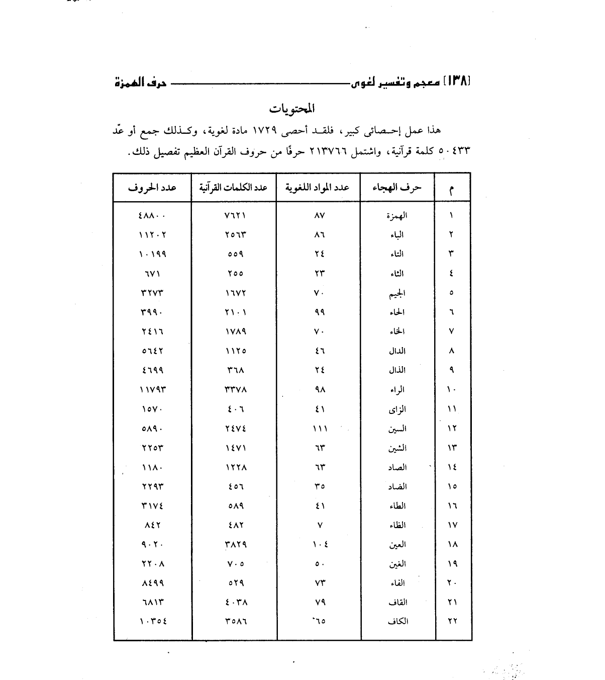 هذا عمل إحصائى كبير، فلقد أحصى 1729 مادة لغوية، وكذلك جمع أو عد 50433 كلمة قرآنية، واشتمل 213766 حرفا من حروف القرآن العظيم تفصيل ذلك.