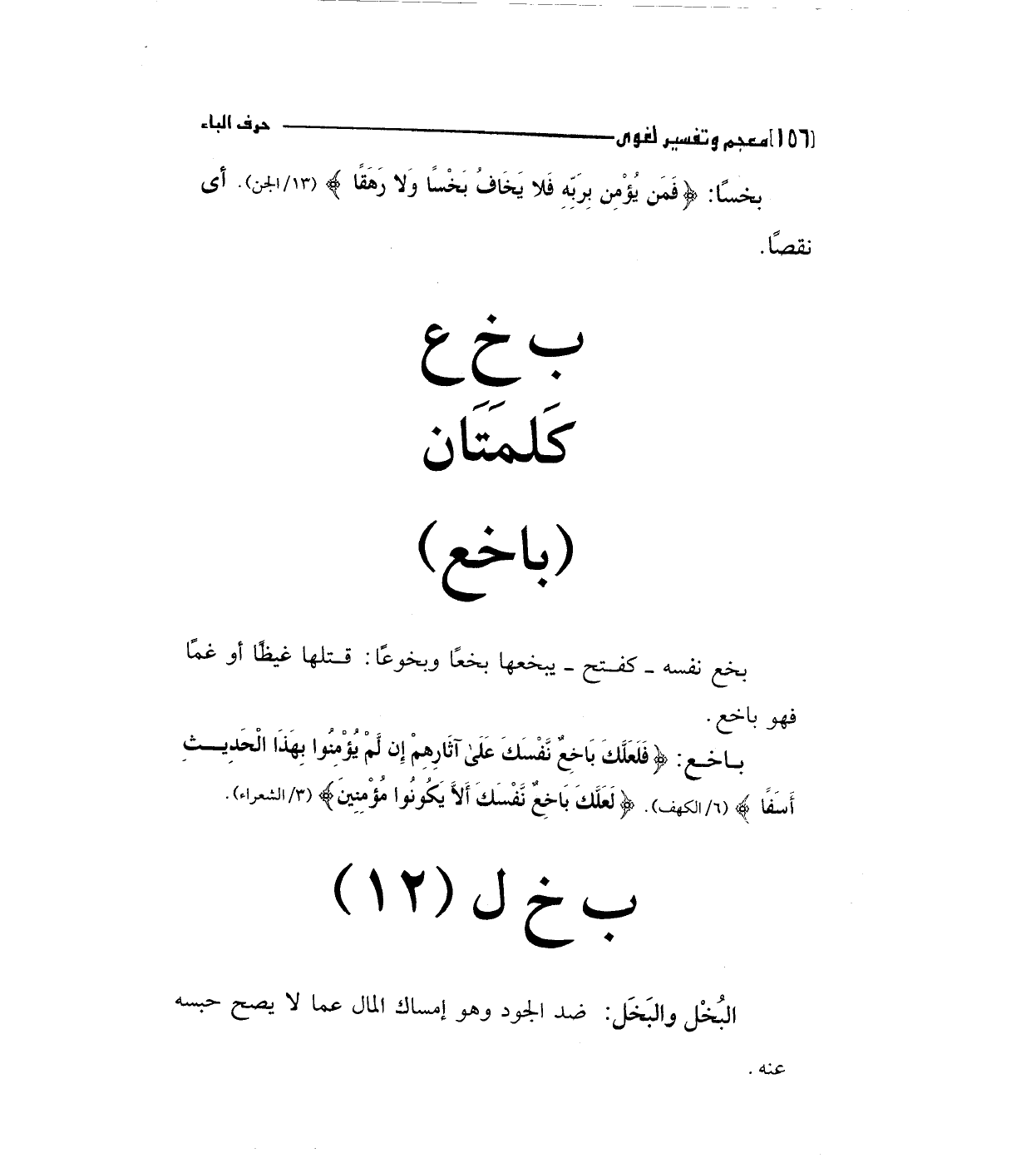 باخع: (فَلَعَلَّكَ بَاخِعٌ نَفْسَكَ عَلَى آثَارِهِمْ إِنْ لَمْ يُؤْمِنُوا بِهَذَا الْحَدِيثِ أَسَفاً) "6/الكهف ". (لَعَلَّكَ بَاخِعٌ نَفْسَكَ أَلاَّ يَكُونُوا مُؤْمِنِينَ) " 3/الشعراء ".