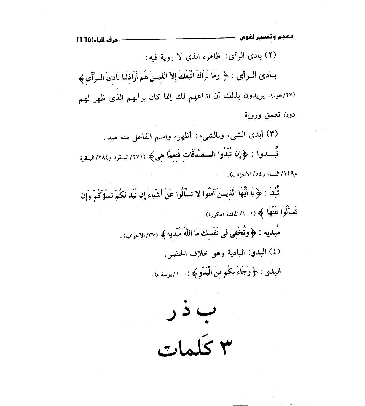 بادي الرأي: (وَمَا نَرَاكَ اتَّبَعَكَ إِلاَّ الَّذِينَ هُمْ أَرَاذِلُنَا بَادِي الرَّأْيِ) "27/ هود " يريدون بذلك أن اتباعهم لك إنما كان برأيهم الذي ظهر لهم دون تعمق وروية.