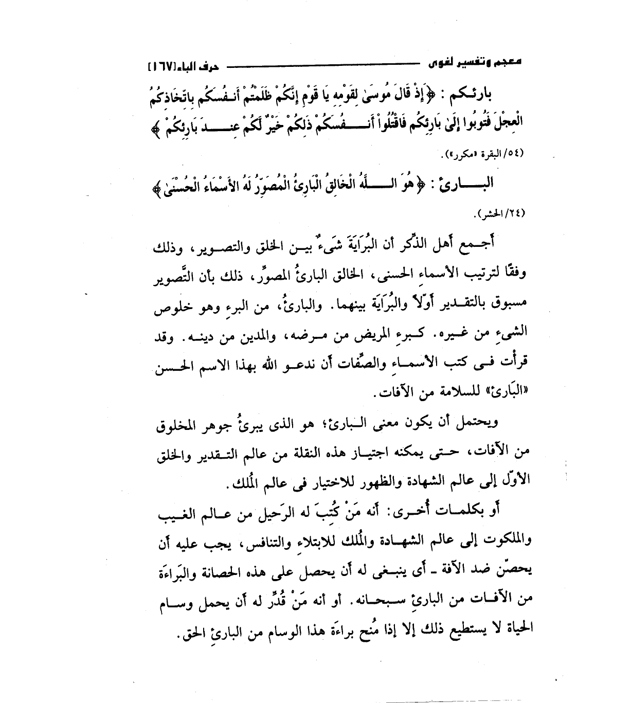 بارئكم: (وَإِذْ قَالَ مُوسَى لِقَوْمِهِ يَا قَوْمِ إِنَّكُمْ ظَلَمْتُمْ أَنفُسَكُمْ بِاتِّخَاذِكُمْ الْعِجْلَ فَتُوبُوا إِلَى بَارِئِكُمْ فَاقْتُلُوا أَنفُسَكُمْ ذَلِكُمْ خَيْرٌ لَكُمْ عِنْدَ بَارِئِكُمْ) "54/البقرة " مكرر"البارئ: (هو الله الخالق البارئ المصور له الأسماء الحسني) " 24/الحشر ".