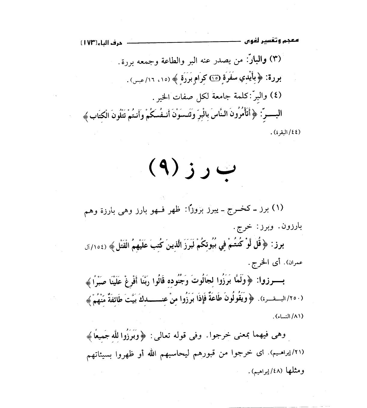 برز: (قُلْ لَوْ كُنْتُمْ فِي بُيُوتِكُمْ لَبَرَزَ الَّذِينَ كُتِبَ عَلَيْهِمْ الْقَتْلُ) "154/آل عمران) أي الخرج.