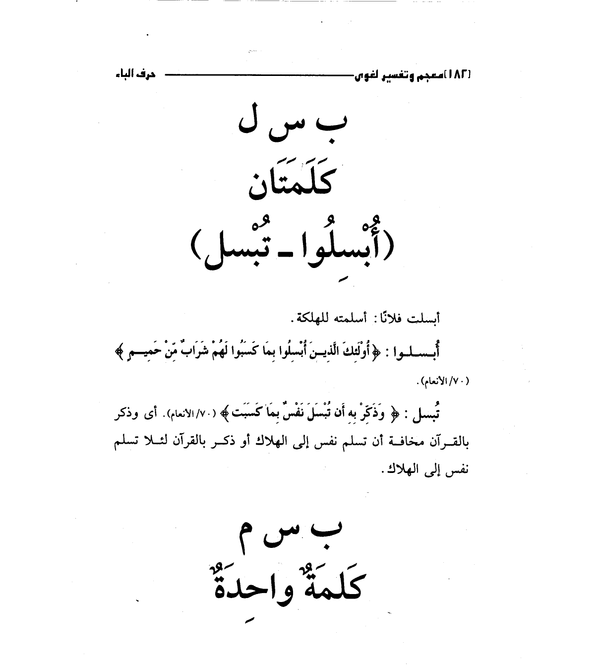 تبسل: (وَذَكِّرْ بِهِ أَنْ تُبْسَلَ نَفْسٌ بِمَا كَسَبَتْ) " 70/ الأنعام"أي وذكر بالقرآن مخافة أن تسلم نفس إلي الهلاك أو ذكر بالقرآن لئلا تسلم نفس إلي الهلاك.