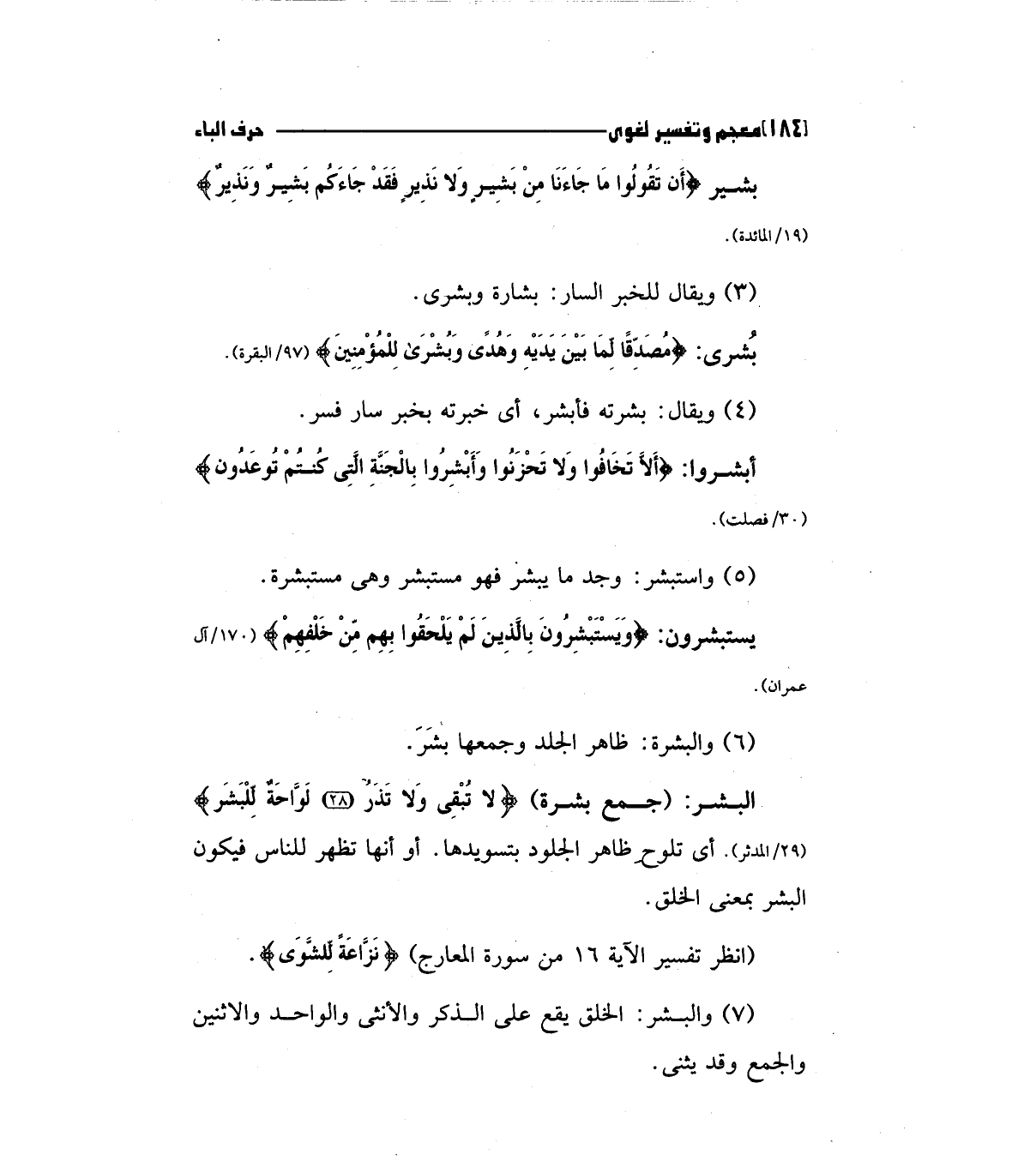 5 - واستبشر: وجد ما يبشر فهو مستبشر وهي مستبشرة يستبشرون: (وَيَسْتَبْشِرُونَ بِالَّذِينَ لَمْ يَلْحَقُوا بِهِمْ مِنْ خَلْفِهِمْ) "170/آل عمران".
