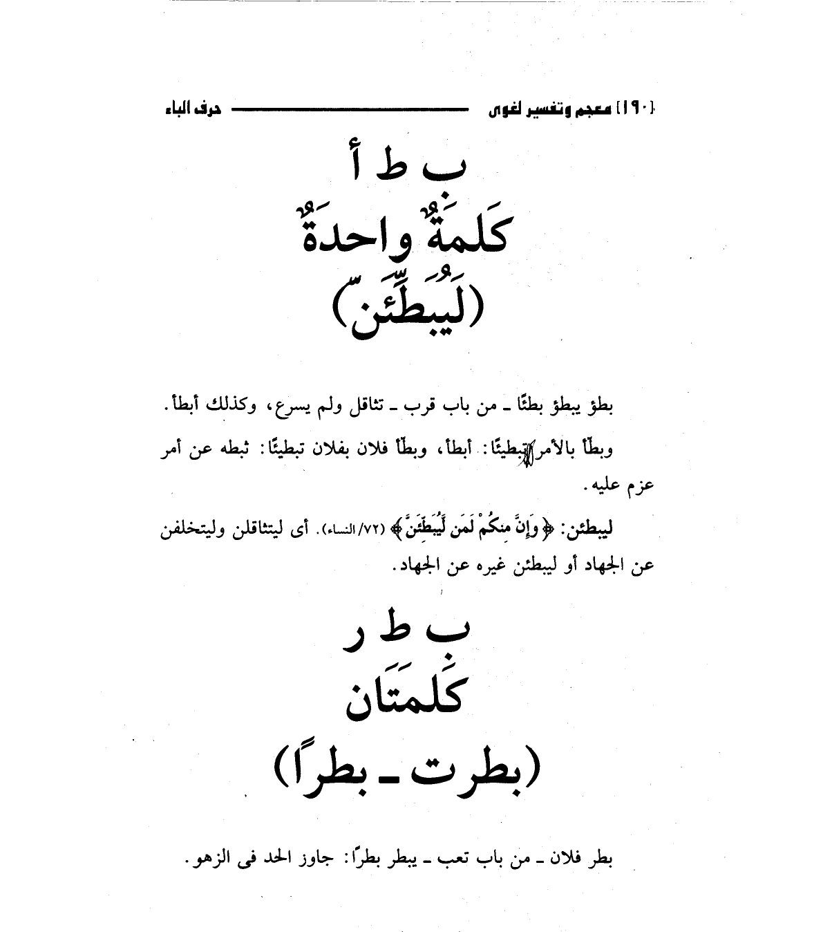 ليبطئن: وَإِنَّ مِنْكُمْ لَمَنْ لَيُبَطِّئَنَّ " 72/النساء " أي ليتثاقلن وليتخلفن عن الجهاد أو ليبطئن غيره عن الجهاد.