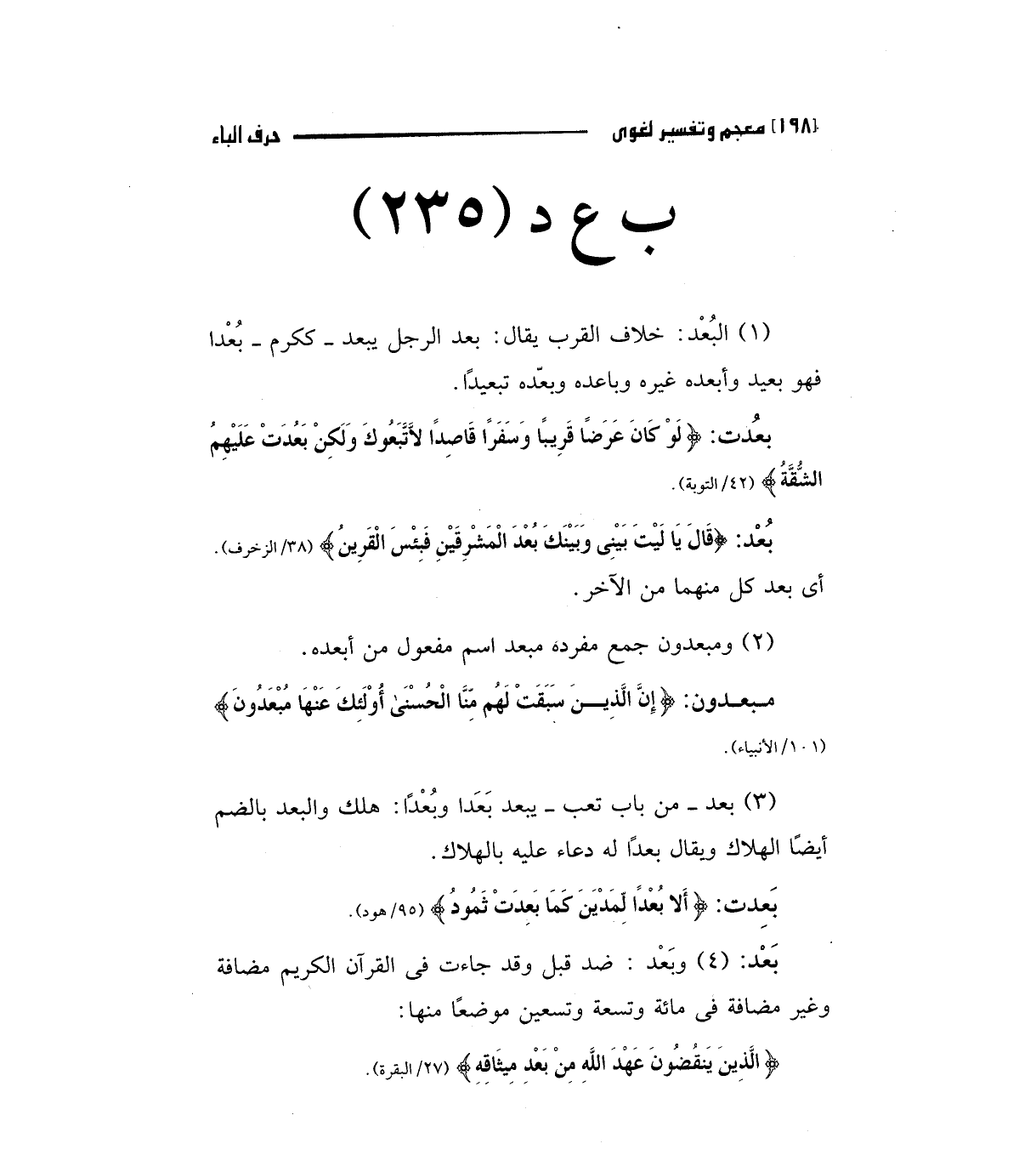 بعد: (قَالَ يَا لَيْتَ بَيْنِي وَبَيْنَكَ بُعْدَ الْمَشْرِقَيْنِ فَبِئْسَ الْقَرِينُ) "38/الزخرف"أي بعد كل منها من الآخر.2 - ومبعدون جمع مفرده مبعد اسم مفعول من أبعده.