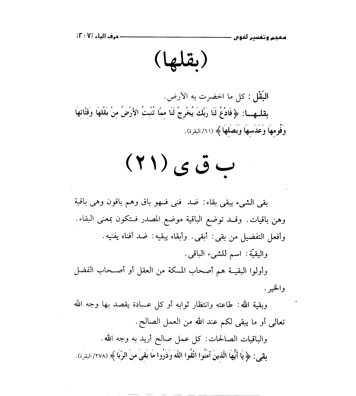 بقي الشئ يبقي بقاء: ضد فهو باق وهم باقون وهي باقية وهن باقيات. وقد توضع الباقية موضع المصدر فتكون بمعني البقاء وأفعل التفضيل من بقي: أبقي وأبقاه يبقيه: ضد أفناه بفنيه.