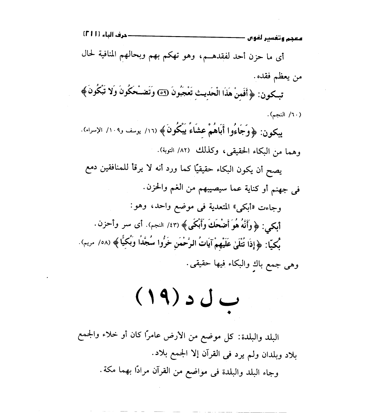 يبكون: (وَجَاءُوا أَبَاهُمْ عِشَاءً يَبْكُونَ) " 16/يوسف و109/الإسراء) وهما من البكاء الحقيقي، وكذلك (82/التوبة ".
