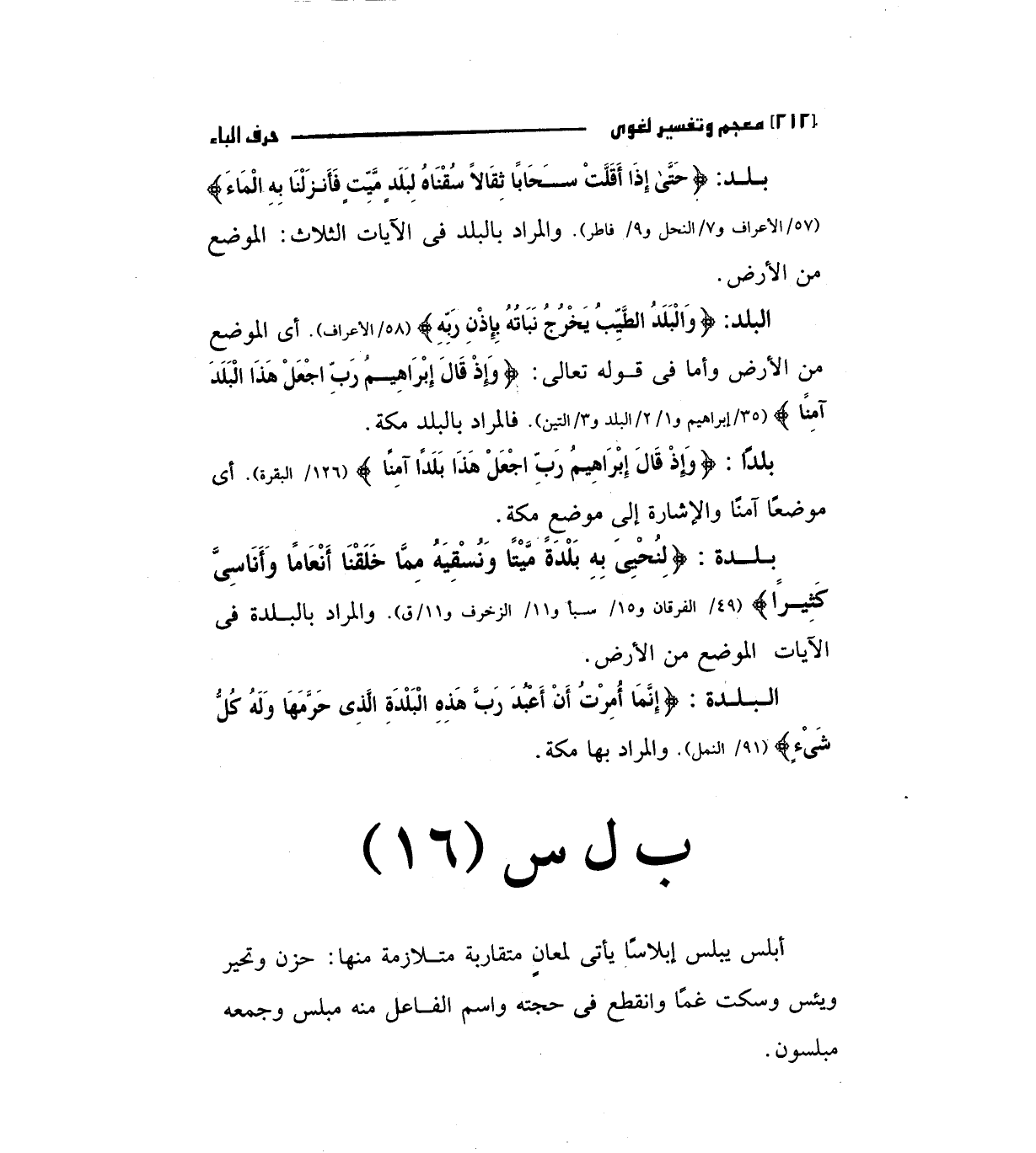 البلد: (وَالْبَلَدُ الطَّيِّبُ يَخْرُجُ نَبَاتُهُ بِإِذْنِ رَبِّهِ) "58/الأعراف" أي الموضع من الأرض وأما في قوله تعالي: (وَإِذْ قَالَ إِبْرَاهِيمُ رَبِّ اجْعَلْ هَذَا الْبَلَدَ آمِناً) "35/إبراهيم و1/ 2/البلدو3/التين) فالمراد بالبلد مكة.