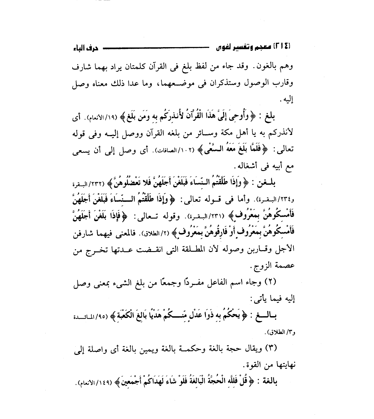 بلغ: (وَأُوحِيَ إِلَيَّ هَذَا الْقُرْآنُ لأُنذِرَكُمْ بِهِ وَمَنْ بَلَغَ) "19/الأنعام " أي لأنذركم به يأهل مكة وسائر من بلغه القرآن ووصل إليه وفي قوله تعالي: (فَلَمَّا بَلَغَ مَعَهُ السَّعْيَ) " 102/الصافات " أي وصل إلي أن يسعي مع أبيه في أشغاله.