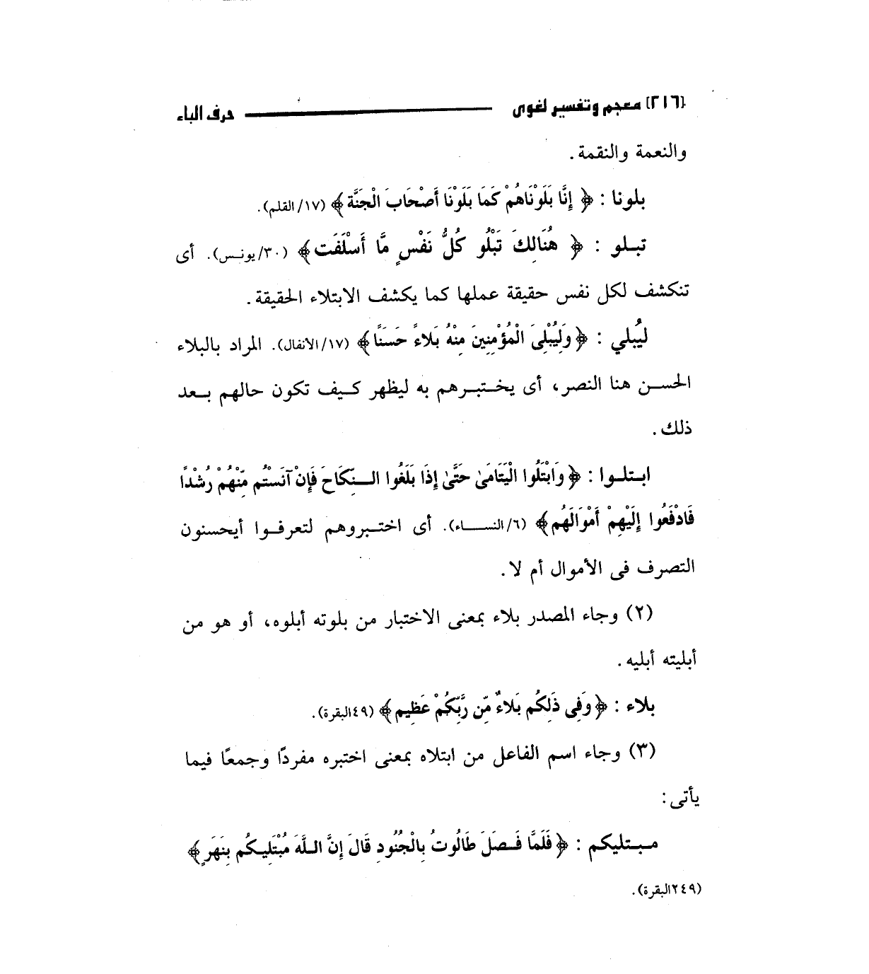 ابتلوا: (وَابْتَلُوا الْيَتَامَى حَتَّى إِذَا بَلَغُوا النِّكَاحَ فَإِنْ آنَسْتُمْ مِنْهُمْ رُشْداً فَادْفَعُوا إِلَيْهِمْ أَمْوَالَهُمْ) "6/النساء" أي اختبروهم لتعرفوا أيحسنون التصرف في الأموال أم لا.