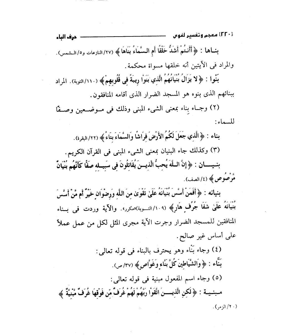بنيانه: (أَفَمَنْ أَسَّسَ بُنْيَانَهُ عَلَى تَقْوَى مِنْ اللَّهِ وَرِضْوَانٍ خَيْرٌ أَمْ مَنْ أَسَّسَ بُنْيَانَهُ عَلَى شَفَا جُرُفٍ هَارٍ) " 109/التوبة " مكرر" والآية وردت في بناء المنافقين للمسجد الضرار وجرت الآية مجري المثل لكل من عمل عملا علي أساس غير صالح.