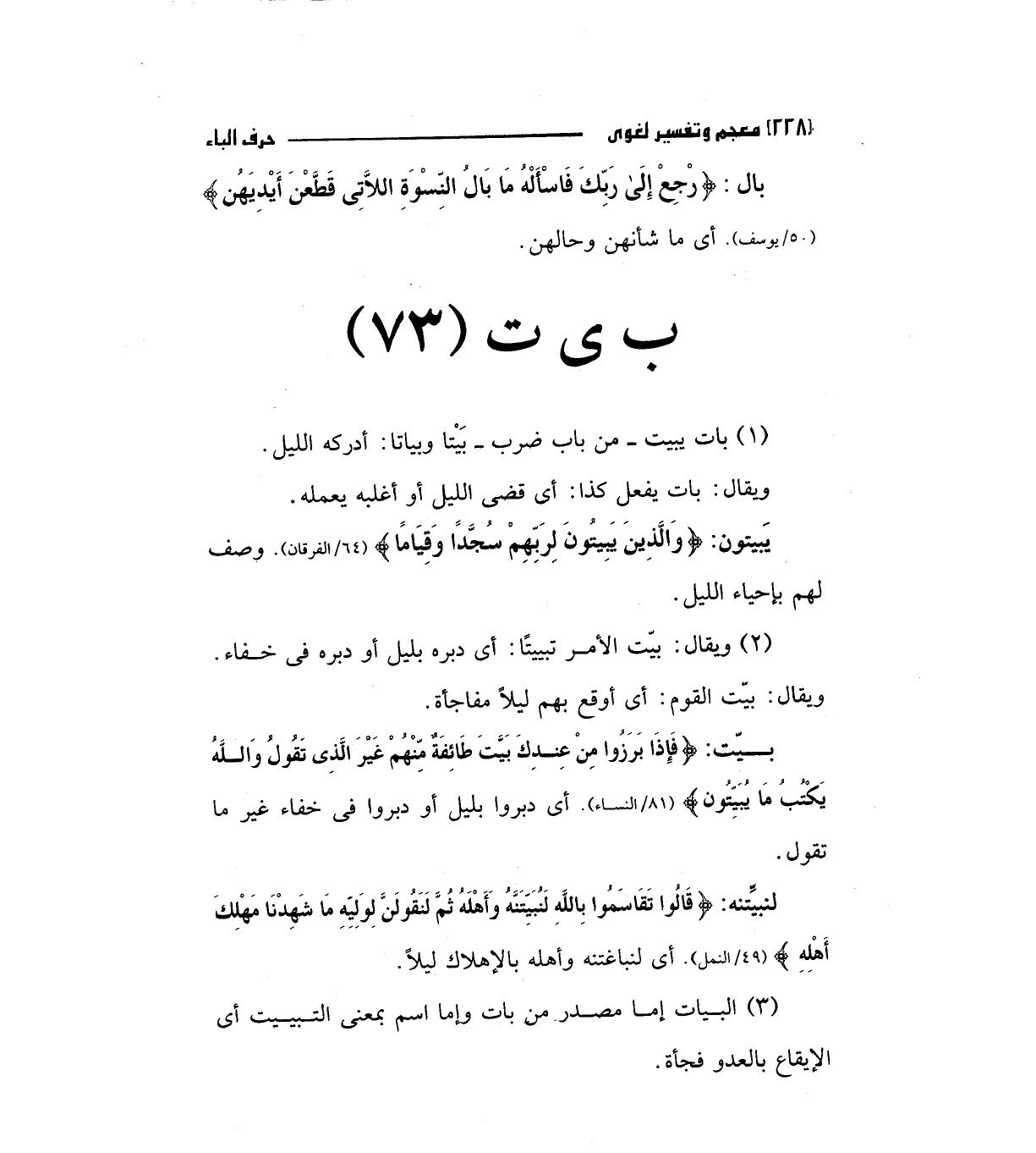 (2) ويقال: بيت الأمر تبييتا: أى دبره بليل أو دبره فى خفاء ويقال: بيت القوم: أى أوقع بهم ليلا مفاجأة