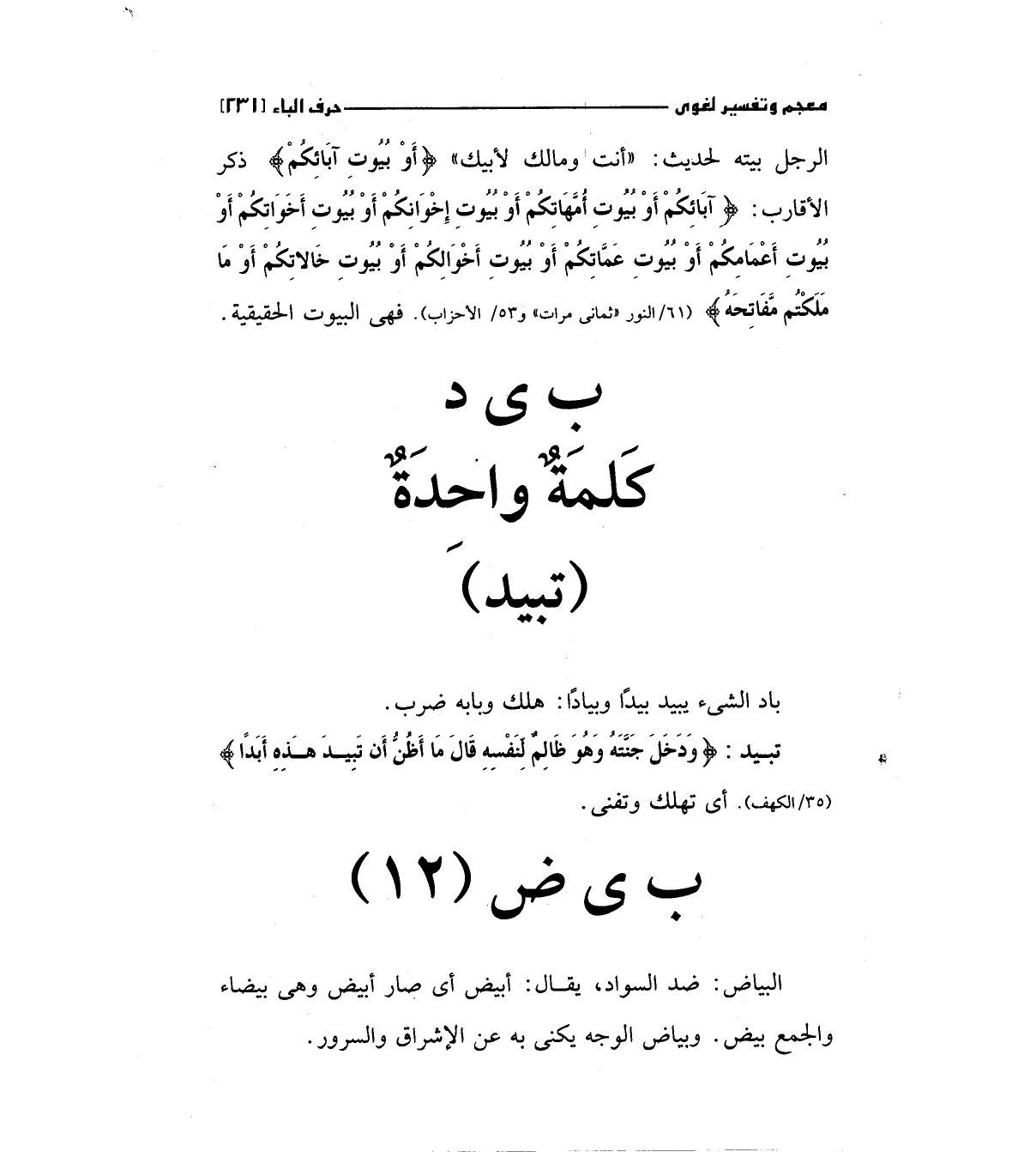 تبيد: (وَدَخَلَ جَنَّتَهُ وَهُوَ ظَالِمٌ لِنَفْسِهِ قَالَ مَا أَظُنُّ أَنْ تَبِيدَ هَذِهِ أَبَداً) (35الكهف) أى تهلك وتفنى.