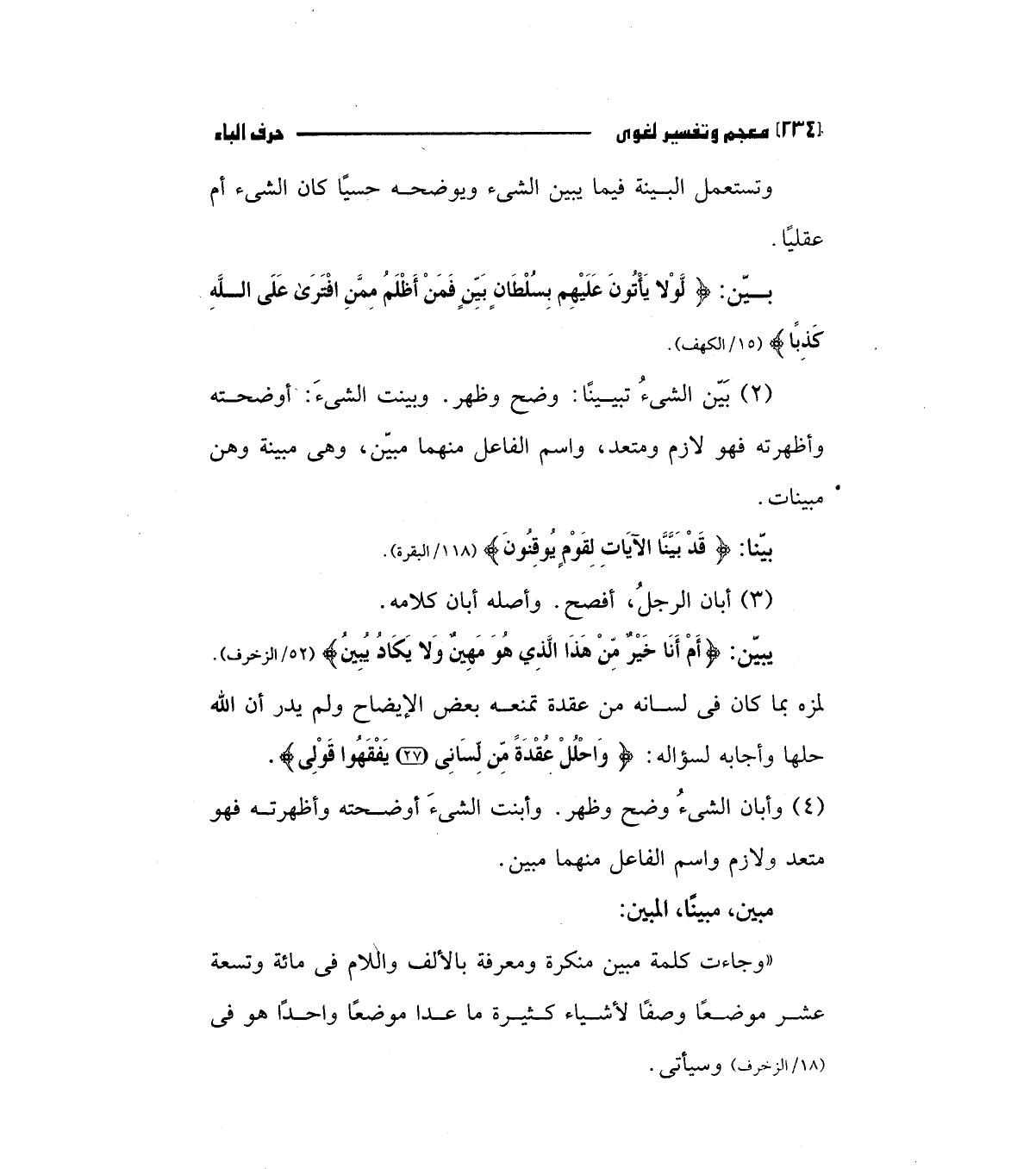 " وجاءت كلمة مبين منكرة ومعرفة بالألف واللام فى مائة وتسعة عشر موضعا وصفا لأشياء كثيرة ما عدا موضعا واحدا هو فى (18/الزخرف) وسيأتى.