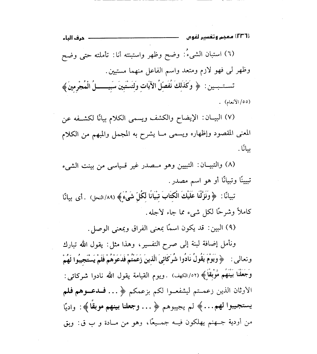 (6) استبان الشىء: وظهر واستبته أنا: تأمله حتى وضح وظهر لى فهو لازم ومتعد واسم الفاعل منهما مستبين.