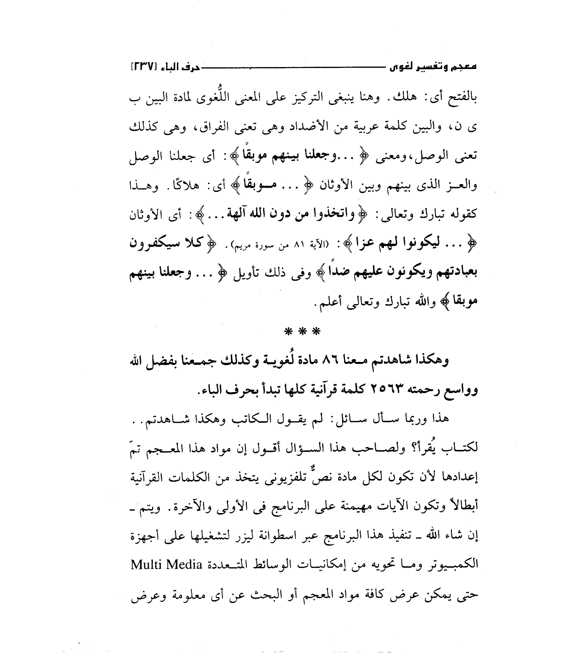 هذا ربما سأل سائل: لم يقول الكاتب وهكذا شاهدتم .. لكتاب يقرأ؟ ولصاحب هذا السؤال أقول إن مواد هذا المعجم تم إعدادها لأن تكون لكل مادة نص تلفزيزنى يتخذ من الكلمات القرآنية أبطالا وتكون الآيات مهيمنة على البرنامج فى الأولى والآخرة. ويتم - إن شاء الله - تنفيذ هذا البرنامج عبر اسطوانة ليزر لتشغيلها على أجهزة الكمبيوتر وما تحويه من إمكانيات الوسائط المتعددة multi media