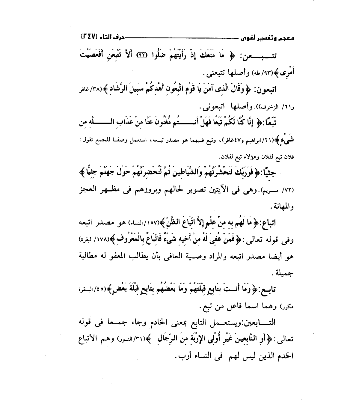 تبعا: (إِنَّا كُنَّا لَكُمْ تَبَعاً فَهَلْ أَنْتُمْ مُغْنُونَ عَنَّا مِنْ عَذَابِ اللَّهِ مِنْ شَيْءٍ) (21/ إبراهيم و 47 غافر)، وتبع فيهما هو مصدر تبعه، استعمل وصفا للجمع تقول فلات تبع لفلان هؤلاء تبع لفلان.