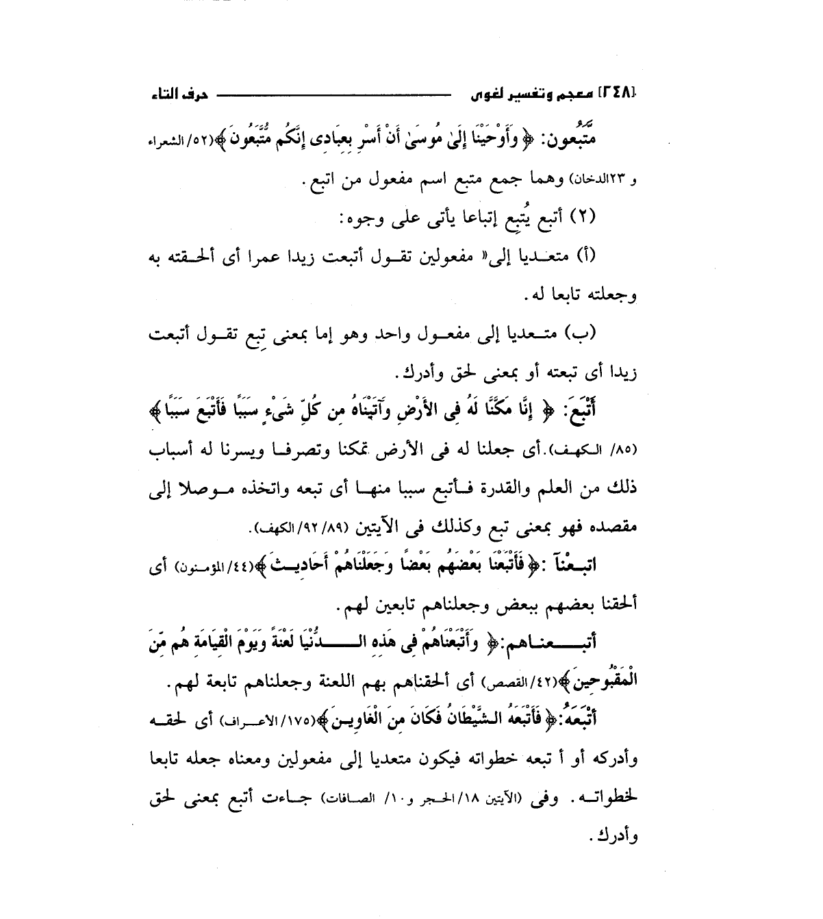 أتبع: (إِنَّا مَكَّنَّا لَهُ فِي الأَرْضِ وَآتَيْنَاهُ مِنْ كُلِّ شَيْءٍ سَبَباً (84) فَأَتْبَعَ سَبَباً) (85/الكهف) أى جعلنا له فى الأرض تمكنا وتصرفا ويسرنا له أسباب ذلك من العلم والقدرة فأتبع سببا منها أى تبعه واتخذه موصلا إلى مقصده فهو بمعنى تبع وكذلك فى الآيتين (89/ 92/ الكهف)