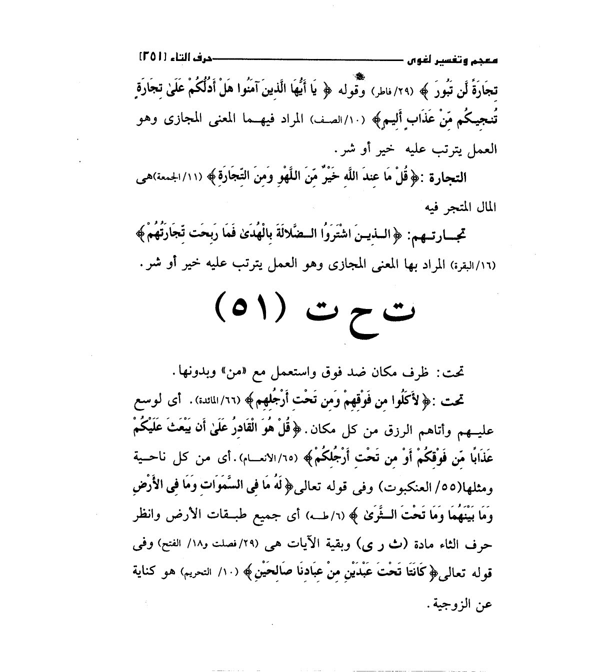 تحت: (لأَكَلُوا مِنْ فَوْقِهِمْ وَمِنْ تَحْتِ أَرْجُلِهِمْ) " 66/المائدة " أي لوسع عليهم وأتاهم الرزق من كل مكان (قُلْ هُوَ الْقَادِرُ عَلَى أَنْ يَبْعَثَ عَلَيْكُمْ عَذَاباً مِنْ فَوْقِكُمْ أَوْ مِنْ تَحْتِ أَرْجُلِكُمْ) " 65/الأنعام " أي من كل ناحية ومثلها (55/العنكبوت) وفي قوله تعالي (لَهُ مَا فِي السَّمَوَاتِ وَمَا فِي الأَرْضِ وَمَا بَيْنَهُمَا وَمَا تَحْتَ الثَّرَى) " 6/طه" أي جمع جميع طبقات الأرض وانظر حرف الثاء مادة (ث ر ي) وبقية الآيات هي (29/فصلت و18/الفتح) وفي قوله تعالي (كَانَتَا تَحْتَ عَبْدَيْنِ مِنْ عِبَادِنَا صَالِحَيْنِ) " 10/التحريم " هو كناية عن الزوجية.