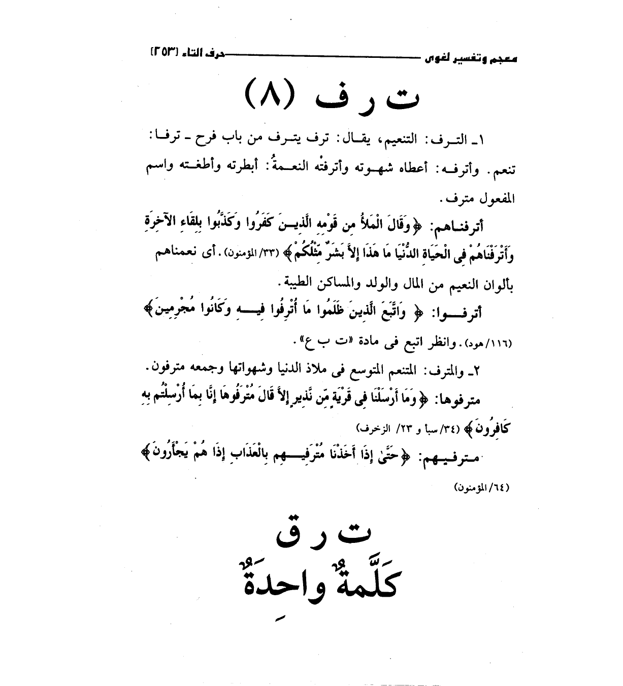 1 - الترف: التنعيم، يقال: ترف يترف من باب فرح - ترفا تنعم. وأترفه: أعطاه شهوته وأترفته النعمة: أبطرته وأطغته واسم المفعول مترف.