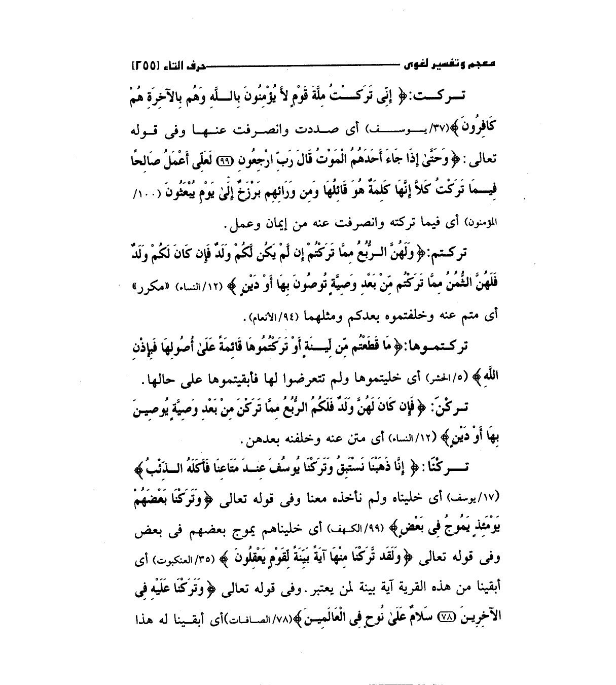 تركت: (إِنِّي تَرَكْتُ مِلَّةَ قَوْمٍ لا يُؤْمِنُونَ بِاللَّهِ وَهُمْ بِالآخِرَةِ هُمْ كَافِرُونَ) " 37/يوسف " أي صددت وانصرفت عنها وفي قوله تعالي: (حَتَّى إِذَا جَاءَ أَحَدَهُمْ الْمَوْتُ قَالَ رَبِّ ارْجِعُونِ (99) لَعَلِّي أَعْمَلُ صَالِحاً فِيمَا تَرَكْتُ كَلاَّ إِنَّهَا كَلِمَةٌ هُوَ قَائِلُهَا وَمِنْ وَرَائِهِمْ بَرْزَخٌ إِلَى يَوْمِ يُبْعَثُونَ) " 100/المؤمنون" أي فيما تركته وانصرفت عنه من إيمان وعمل.