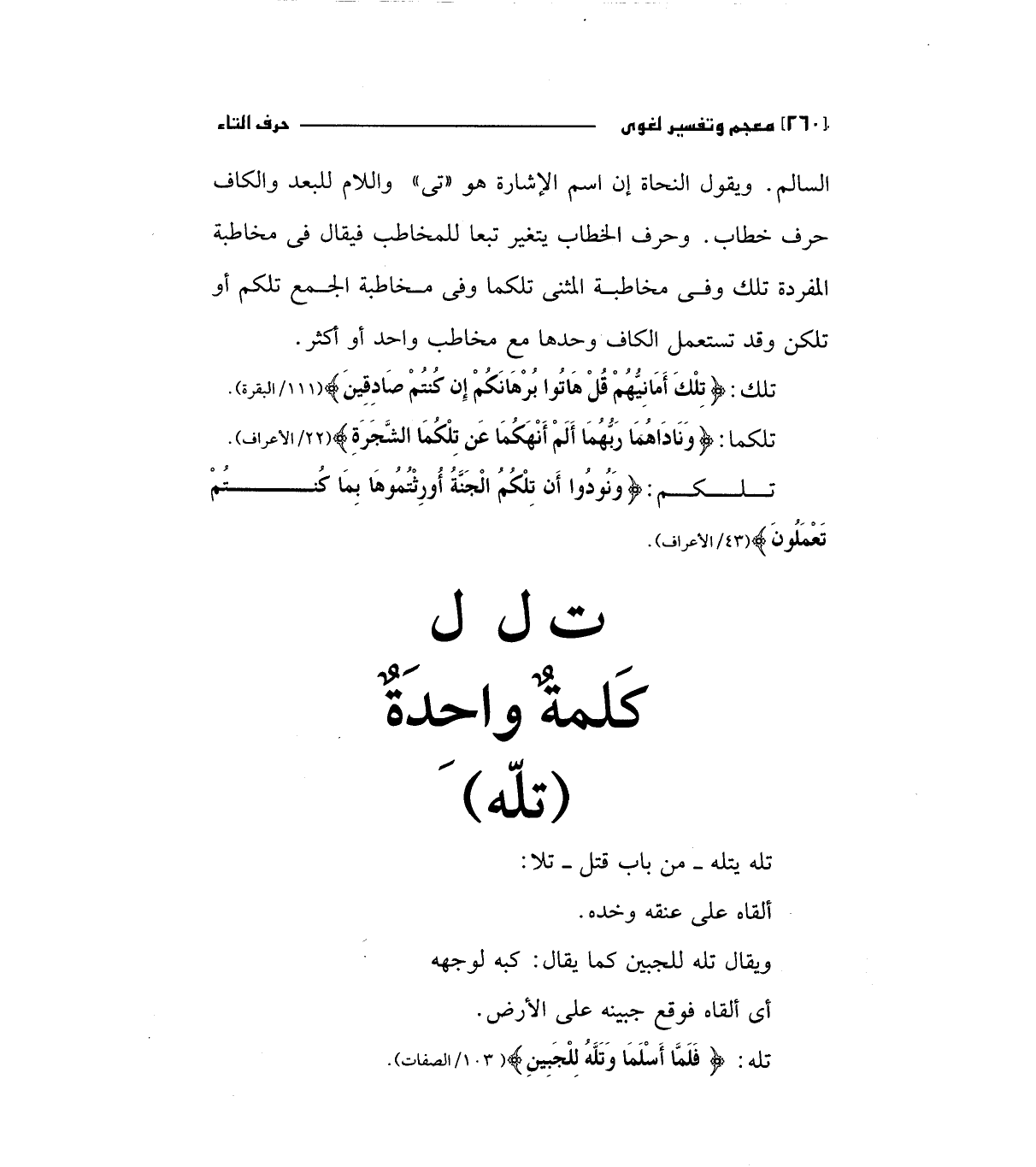 السالم. ويقول النحاة إن اسم الإشارة هو "تي " واللام للبعد والكاف حرف خطاب. وحرف الخطاب يتغير تبعا للمخاطب فيقال في مخاطبة المفردة تلك وفي مخاطبة المثني تلكما وفي مخاطبة الجمع تلكم أو تلكن وقد تستعمل الكاف وحدها مع مخاطب واحد أو أكثر.