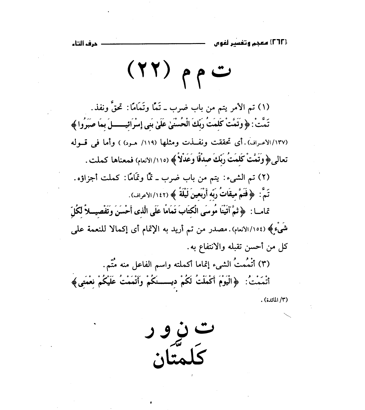 1 - تم الأمر يتم من باب ضرب - تما وتماما: تحق ونفذ تمت: (وَتَمَّتْ كَلِمَةُ رَبِّكَ الْحُسْنَى عَلَى بَنِي إِسْرَائِيلَ بِمَا صَبَرُوا) " 137/الأعراف " أي تحققت ونفذت ومثلها (119/هود) وأما في قوله تعالي (وَتَمَّتْ كَلِمَةُ رَبِّكَ صِدْقاً وَعَدْلاً) "115/الأنعام " فمعناها كملت