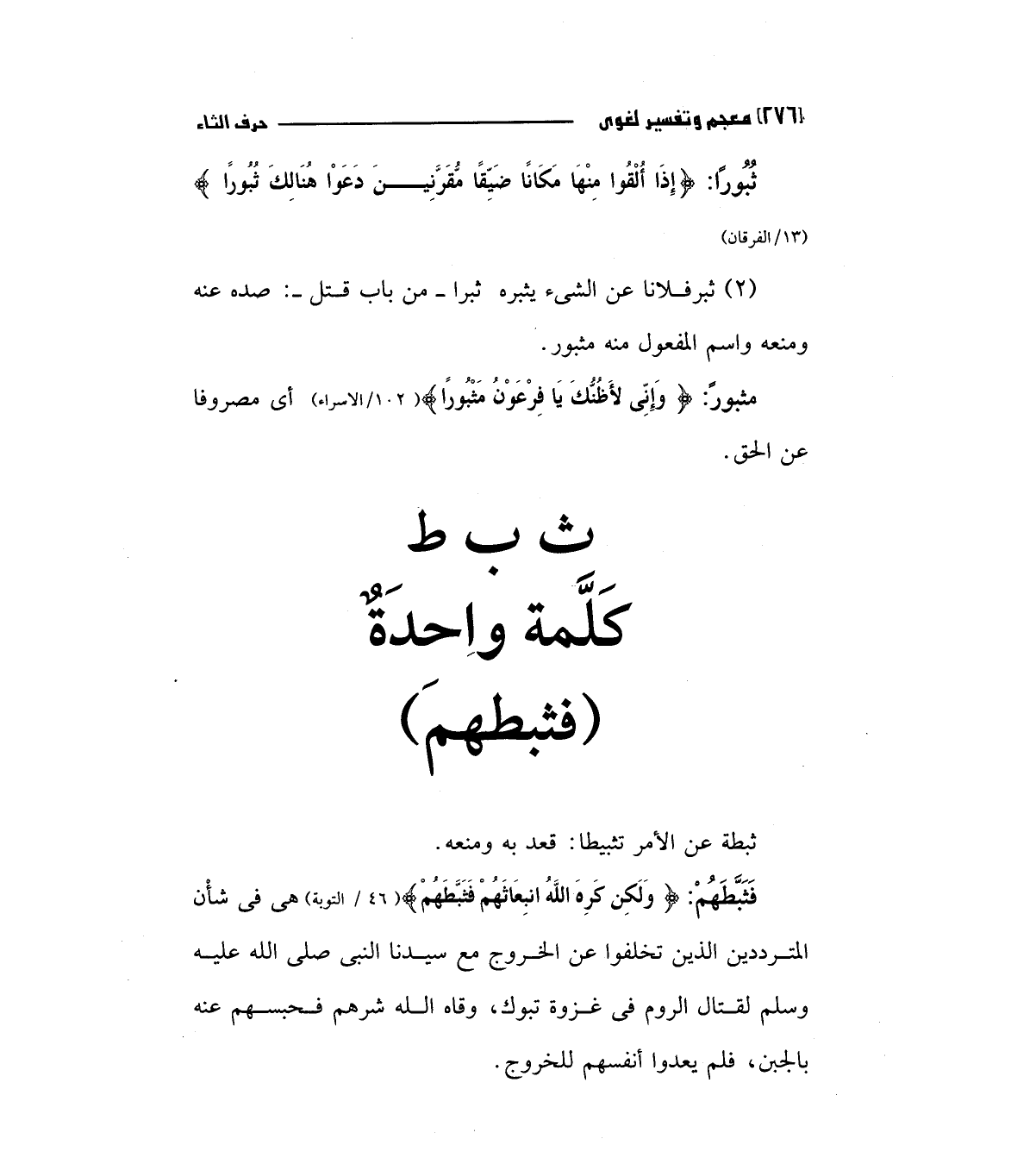 فثبطهم: (وَلَكِنْ كَرِهَ اللَّهُ انْبِعَاثَهُمْ فَثَبَّطَهُمْ) "46/التوبة " هي فيشأن المترددين الذين تخلفوا عن الخروج مع سيدنا النبي صلي الله عليه وسلم لقتال الروم في غزوة تبوك، وقاه الله شرهم فحبسهم عنه بالجبن، فلم يعدوا أنفسهم للخروج.