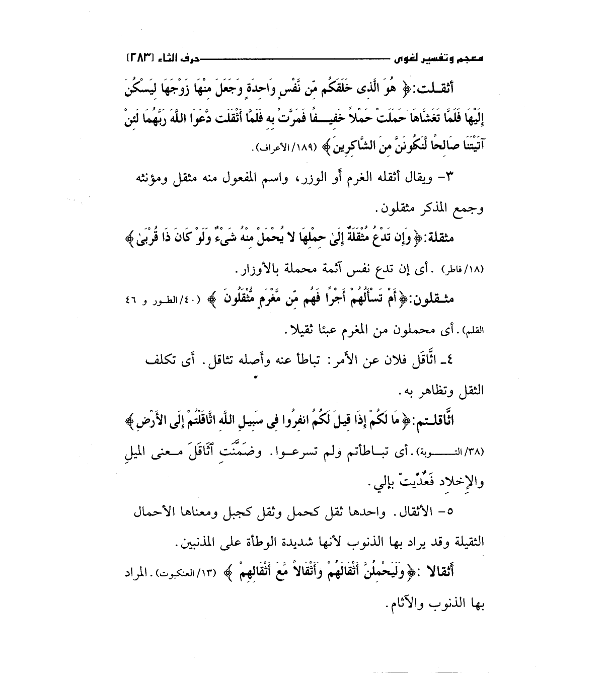 اثاقلتم: (مَا لَكُمْ إِذَا قِيلَ لَكُمْ انفِرُوا فِي سَبِيلِ اللَّهِ اثَّاقَلْتُمْ إِلَى الأَرْضِ) " 38/التوبة " أي تباطأتم ولم تسرعوا وضمنت أثاقل معني الميل والإخلاد فعديت بإالي.