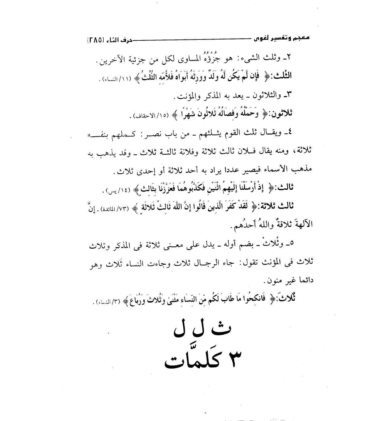 4 - ويقال ثلث القوم يثلثهم - من باب نصر: كملهم بنفسه ثلاثة ومنه يقال فلان ثالث ثلاثة وفلانة ثالثة ثلاث - وقد يذهب به مذهب الأسماء فيصير عددا راد به أحد ثلاثة أو إحدي ثلاث