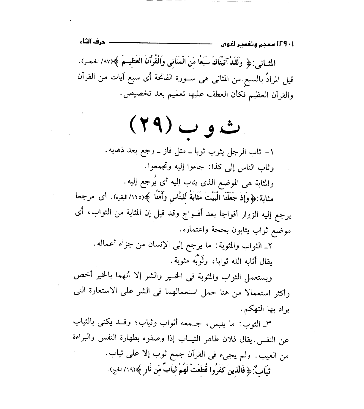 3 - الثوب: ما يلبس، جمعه أثواب وثياب، وقد يكني بالثياب عن النفس يقال فلان طاهر الثياب إذا وصفوه بطهارة النفس والبراءة من العيب. ولم يجئ في القرآن جمع ثوب إلا علي ثياب.