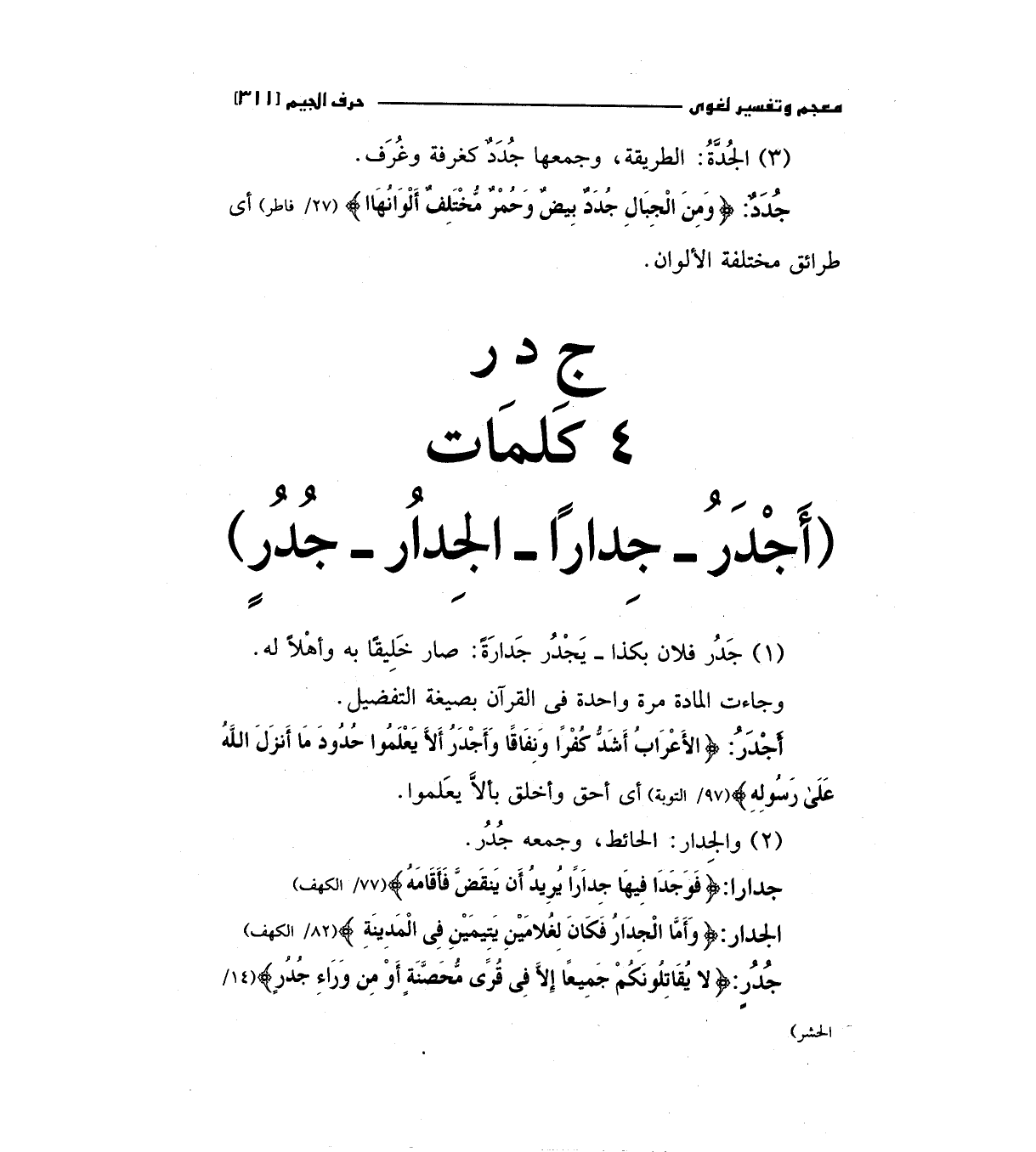 جدر: (لا يُقَاتِلُونَكُمْ جَمِيعاً إِلاَّ فِي قُرًى مُحَصَّنَةٍ أَوْ مِنْ وَرَاءِ جُدُرٍ) "14/الحشر ".