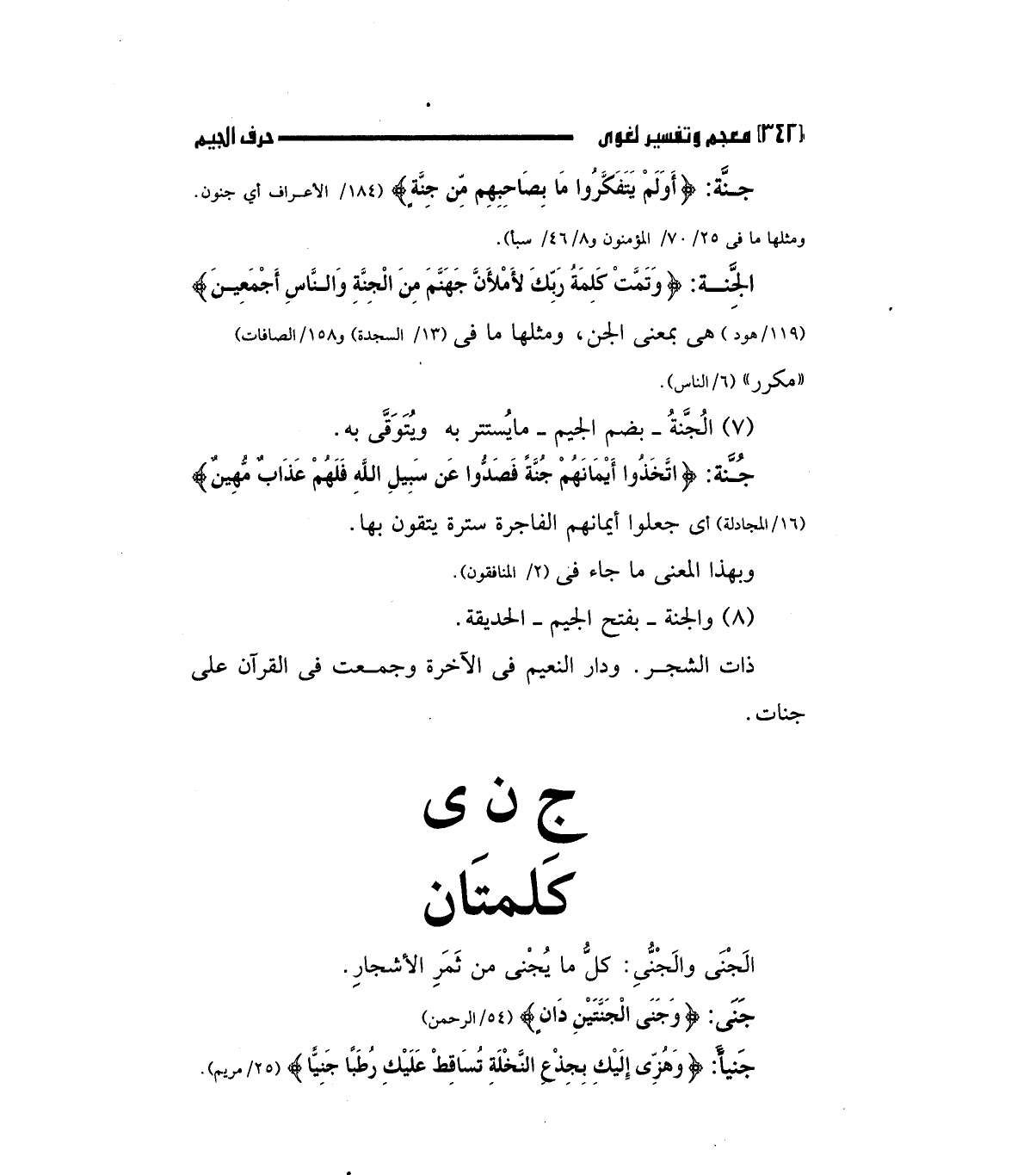 جنة: (أَوَلَمْ يَتَفَكَّرُوا مَا بِصَاحِبِهِمْ مِنْ جِنَّةٍ) "184/الأعراف أي جنون. ومثلها ما في 25/ 70/المؤمنون و8/ 46/سبأ".